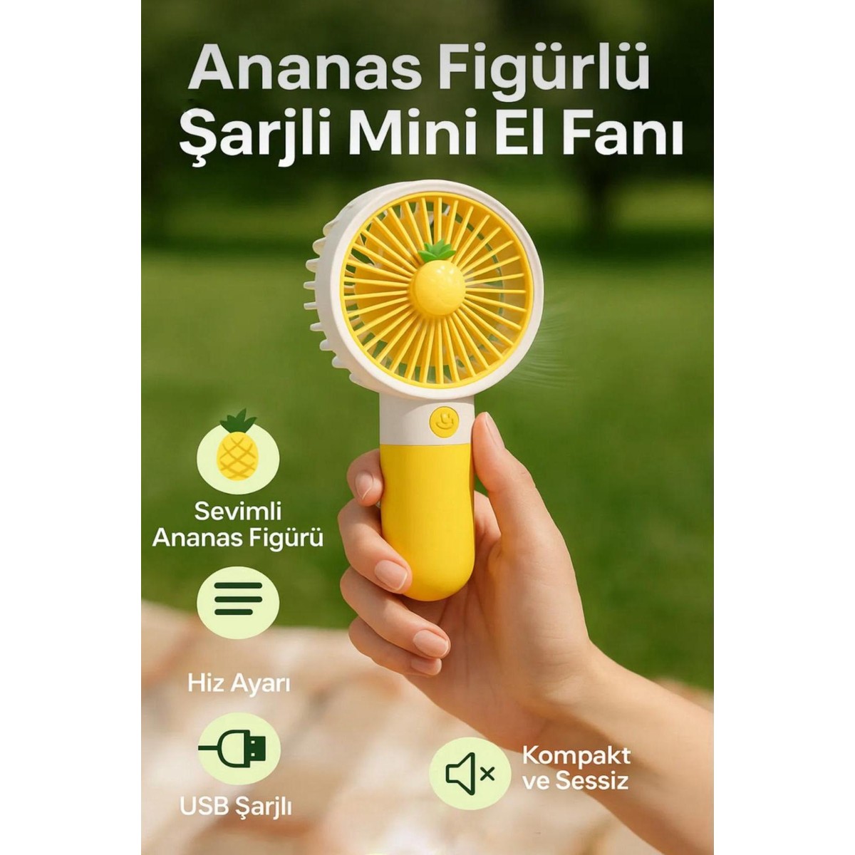 Yazın en tatlı serinliği Figürlü Şarjlı Mini El Fanı ile geliyor! Ananas temalı eğlenceli tasarımıyla hem dikkat çeker hem de serinliği cebinize taşır.USB üzerinden kolayca şarj edilebilir bataryası ile her yerde kullanıma uygundur. Powerbank, bilgisayar veya adaptörle hızlıca şarj edin, serinliği yanınızda taşıyın! İhtiyacınıza göre ayarlanabilir hız kademesi sayesinde ister hafif bir esinti ister güçlü bir serinlik, tek tuşla kontrol sizde! Ofiste, otobüste ya da ders çalışırken rahatsız etmeyen sessiz motoru sayesinde serinliğin keyfini her yerde çıkarın. Minik boyutuyla çantanıza rahatlıkla sığar. Yazın vazgeçilmez hediyesi! Doğum günlerinde, bayramlarda veya yaz partilerinde sevdiklerinize tatlı bir serinlik armağan edin.