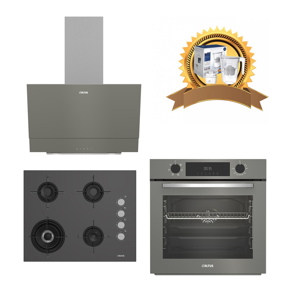 Altus Gri Cam Ankastre Set 322 G Turbo – 189 Dg Woklu – 510 G Davlumbaz – Sürahihediyeli