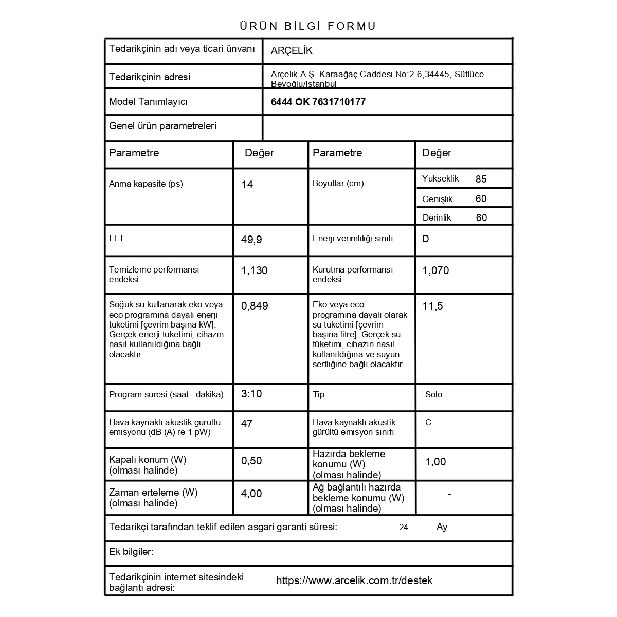 Arçelik 6444 Ok D Enerji Sınıfı 4 Programlı Bulaşık Makinesi