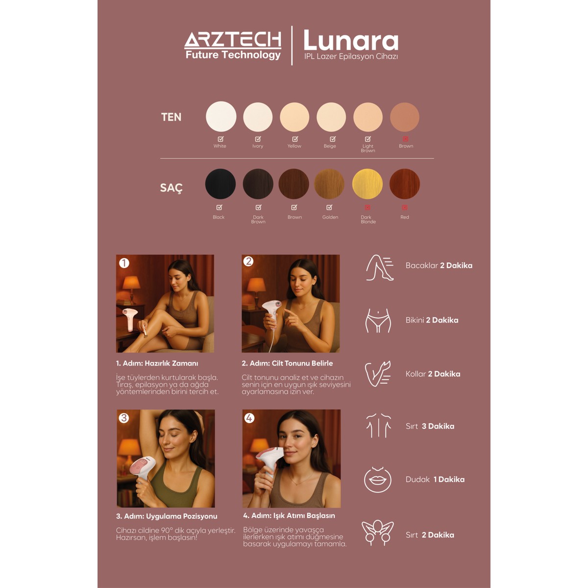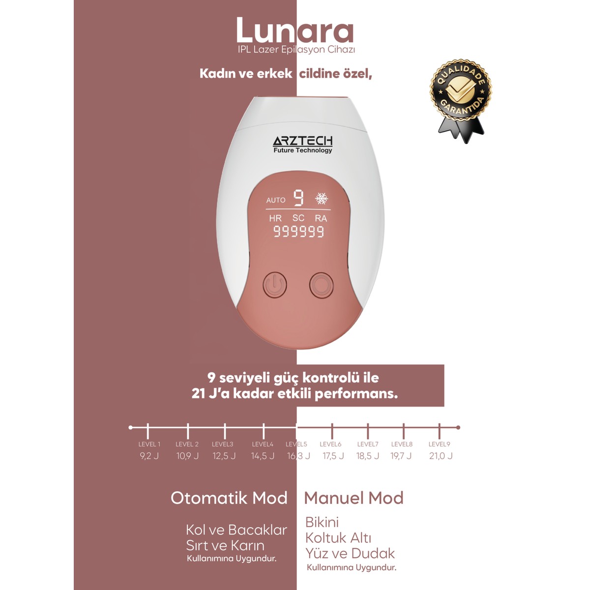 ARZTECH Lunara buzlu Lazer IPL Epilasyon Cihazı – 999.999 Flaş, Epilasyon Deneyimi! Pürüzsüz, sağlıklı ve parlak bir cilt artık hayal değil….. IGBT özelliği ile hızlı atış imkanı saniyede 3 atış yüksek güçte tek atış yaparak sizi bekletmez….. 999.999 flaş kapasitesiyle uzun yıllar güvenle kullanabileceğiniz bu cihaz, sadece istenmeyen tüylerden kurtulmanızı sağlamakla kalmaz, aynı zamanda cildinizi yeniler ve canlandırır! Uzun Ömürlü atış – 999.999 flaş ile Minimum 10 yıl boyunca kullanım sağlar. Buz lazer teknolojisi, cildi soğutarak ferahlik sağlar. 21 Joule enerji gücü ve 9 farklı seviye ile cilt tipinize en uygun ayarı seçin. HR-SR-SC IPL teknolojisi, kıl köklerine doğrudan etki ederek tekrar çıkmasını engeller. Otomatik ve Manuel Kullanım – Farklı mod seçenekleriyle vücudunuzun her bölgesinde rahat kullanım. Yüksek güçte hızlı atış özelliği. CE belgeli, Avrupa Birliği standartlarına uygun güvenli epilasyon deneyimi. ARZTECH Lunara Buz Lazer IPL Epilasyon Cihazı , Güç Adaptörü ,Türkçe Kullanım Kılavuzu , Taşıma Bez Çantası , Koruyucu Gözlük – 3 tip cam filtre, traş bıçağı. Xenon Kuvars Lamba , Dalga Boyu: 530nm ÖNEMLİ NOT : IPL Lazer cihazları kişisel bakım ürünleri olması sebebi ile dış jelatini yırtılan ve kutusu açılan ürünler iade edilemez, arızalı teknik servis raporu ile iade edilebilir veya raporsuz değişim yapılabilir….