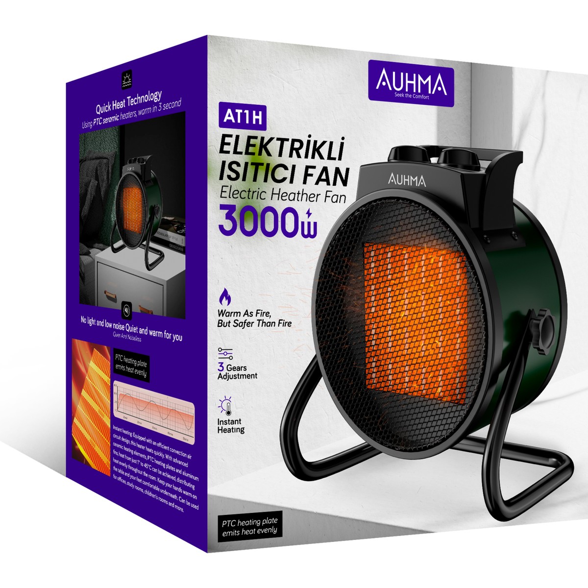 Auhma AT1H Elektrikli Isıtıcı Fan, güçlü 3000W PTC seramik ısıtma teknolojisi ile sadece 3 saniyede hızlı ısınma sağlar. Kompakt tasarımı sayesinde ofis, çalışma odası, çocuk odası ve yaşam alanlarında güvenle kullanılabilir.