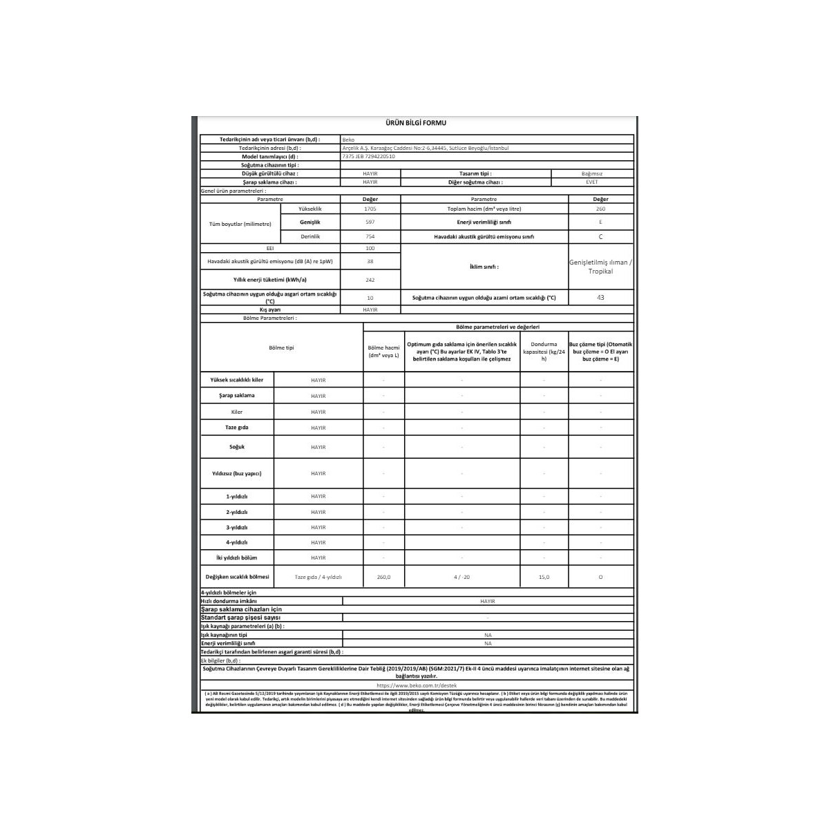 Genel ÖzelliklerSıcaklık Yükselme Süresi (Saat)11Ürün RengiBeyazDondurucu YeriDikey DondurucuElektronik GöstergeElectronic display on door – Kapı üzerinde elektronik display (Touch)Kontrol SistemiElektronikEko ModuVarProSmart™ Inverter KompresörVarKapı Yönü DeğiştirmeVarİklim SınıfıSN-TSes Seviyesi38 dBAToplam Hacim (L)260 LSes Seviyesi SınıfıCSoğutma/Dondurma ModuTaze gıda / Dondurucu (Dört yıldızlı)Dondurucu Bölme TeknolojisiJokerDondurucu Bölme ÖzellikleriToplam Dondurucu Bölme Sayısı7Dondurucu Çekmece Sayısı5Buzluk TipiKapaklı buzlukGünlük Dondurma Kapasitesi (kg)15 kgDondurucu Bölme Hacmi (L)260 LTüketim BilgileriEnerji SınıfıEYıllık Enerji Tüketimi (kWh) 241.89Günlük Enerji Tüketimi (kwh/Gün)0.595Günlük enerji tüketimi 16°C (kWh/24h) (EU_2021_EP)0.38Soğutucu Bölme ÖzellikleriSoğutma SistemiNo FrostHızlı SoğutmaVarÖlçülerAğırlık: Paketsiz69 kgBoyut (cm) (GxYxD)170.5 cmDerinlik75.4 cmBoyut (cm) (GxYxD)59.7 cm