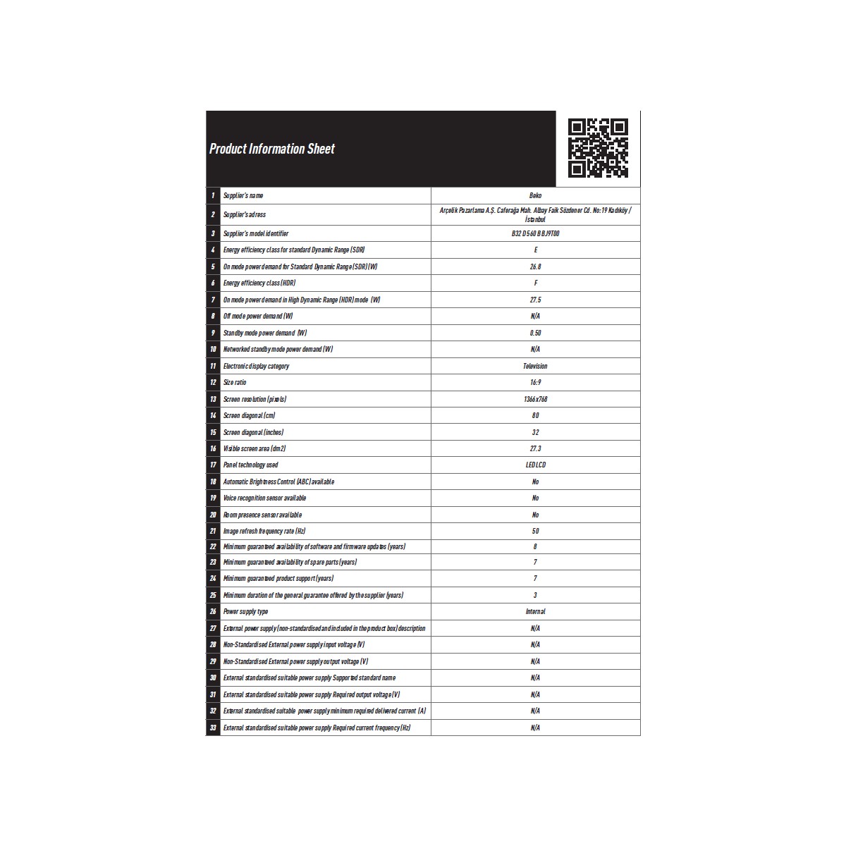 Beko B32 D 500 B 32″ 81 Ekran Uydu Alıcılı Full HD LED TV