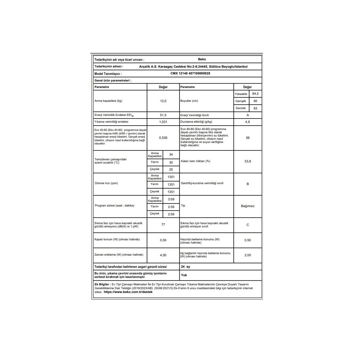 Beko Cmx 12140 A Enerji Sınıfı 12 kg 1400 Devir Çamaşır Makinası