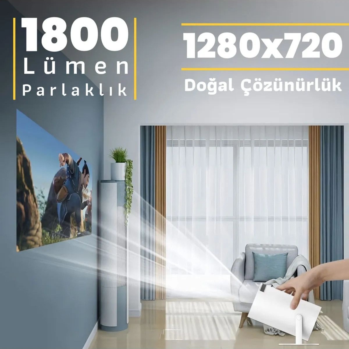 – Yüksek çözünürlükteki 1280×720 piksel ekranı ile net ve canlı görüntüler sunar.; – 1800 lümen parlaklık değeri sayesinde, orta aydınlatmalı odalarda bile etkileyici bir görüntü kalitesi sağlar.; – HDMI bağlantı noktası ile modern televizyonlar ve bilgisayarlarla kolayca uyumlu çalışır.; – Çok yönlülüğüyle film izleme, oyun oynama veya iş toplantıları gibi çeşitli multimedya ihtiyaçlarını karşılar.