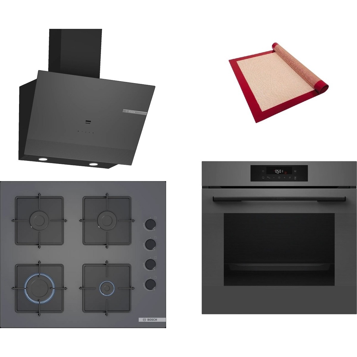 Bosch Gri 3 Lü Ankastre Set 453 ( HJG852YN0T – POP6C9P30O – DWK67PJ70T ) – 3D Fry Hava ile Kızartma – Pişirme Matı ile