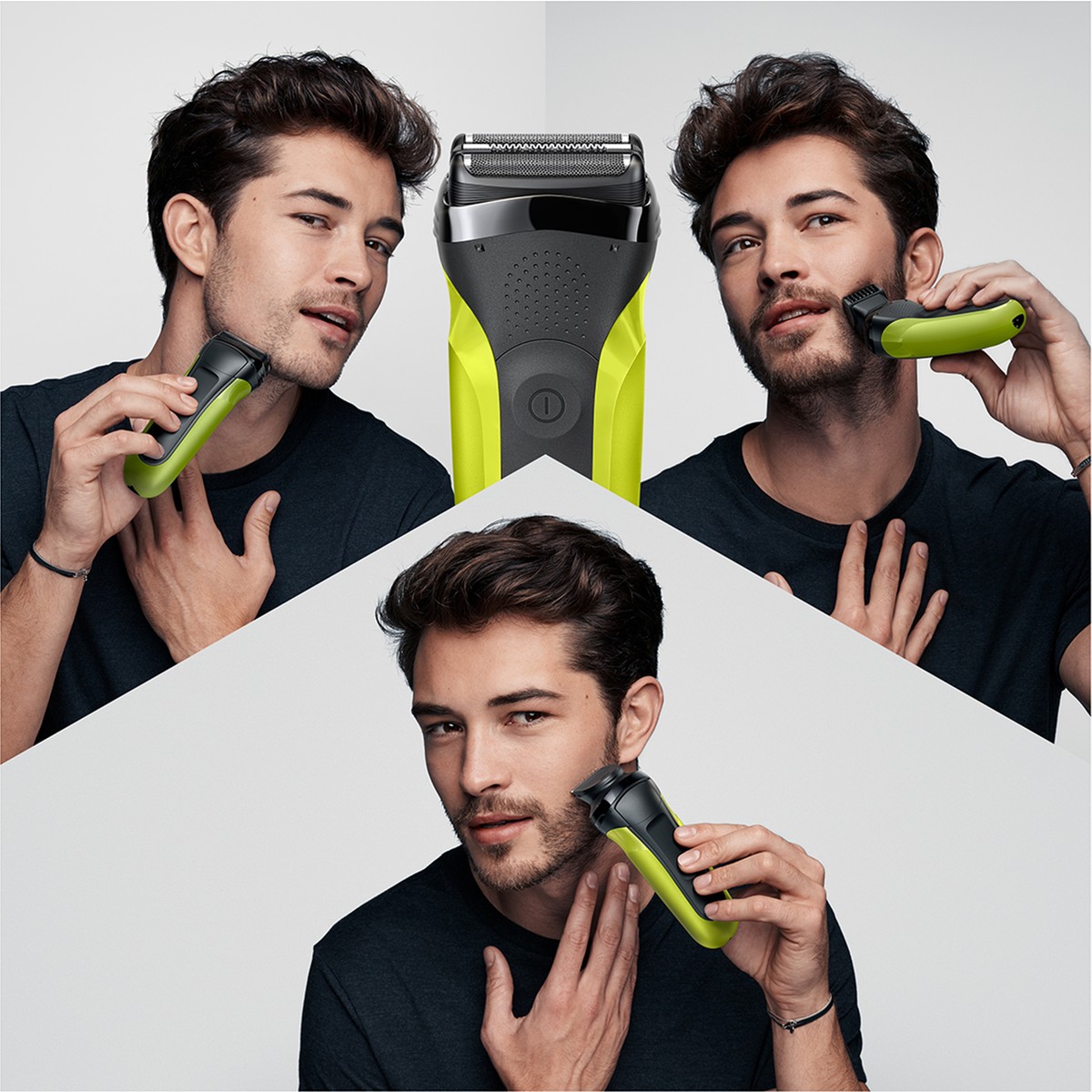 - Braun 3 serisi 300 BT 3’ü 1 arada kuru kullanım kablosuz tıraş makinesi ile bıyık, ense, favori ve yüz bölgelerinde bulunan kılları şekillendirebilirsiniz.