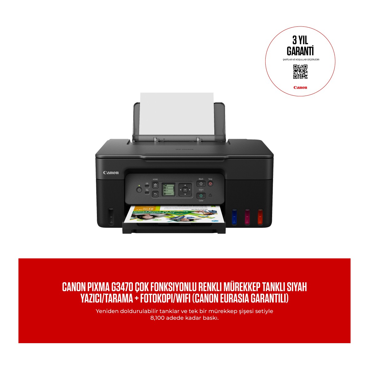 Canon PIXMA G3470 Çok Fonksiyonlu Renkli Mürekkep Tanklı Siyah Yazıcı/Tarama + Fotokopi/Wifi (Canon Eurasia Garantili)