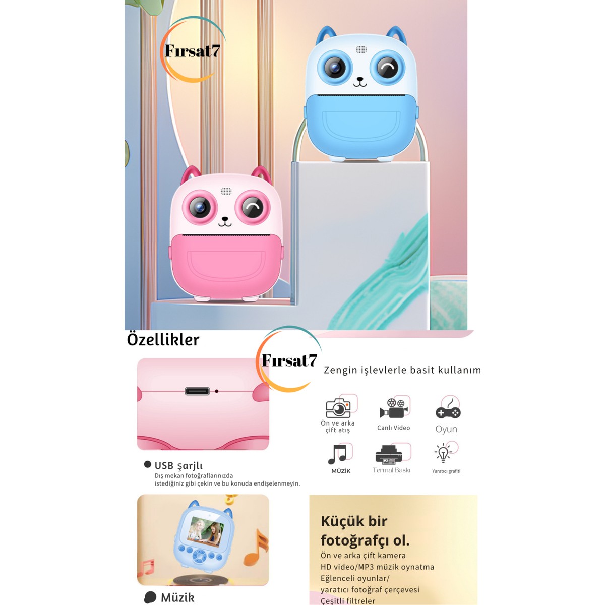 • Ekstra Eğlence ve Etkileşim: Bu şipşak fotoğraf kamerası çeşitli çizgi film fotoğraf çerçeveleri, renk filtreleri, müzik çalma ve oyun işlevlerini içerir.