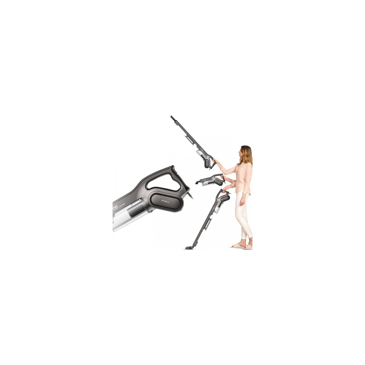 Esnek Temizlik: Dönerek toz alma yolu, Yeni yan vidalı filtre teknolojisi, filtre elemanını tıkamadan ve emişi etkilemeden büyük kalıntıları, tozu, kılları vb. temizler. Mobilyaların tabanını temizlemek için boşluğa girebilir.