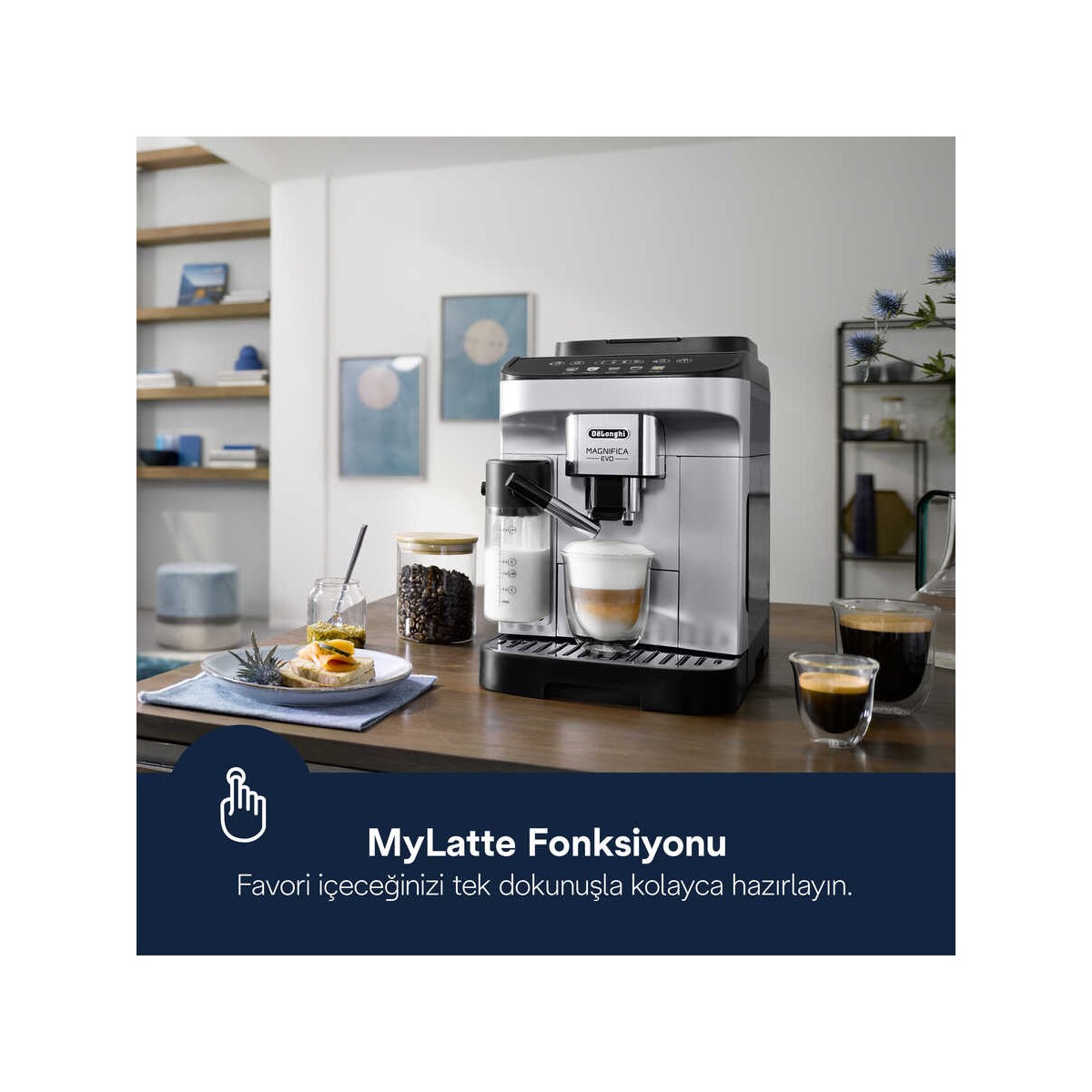 Magnifica Evo, ileri teknolojisi, otantik içecekleri ve şık, metalik-siyah tasarımıyla De’Longhi deneyimini somutlaştırıyor.