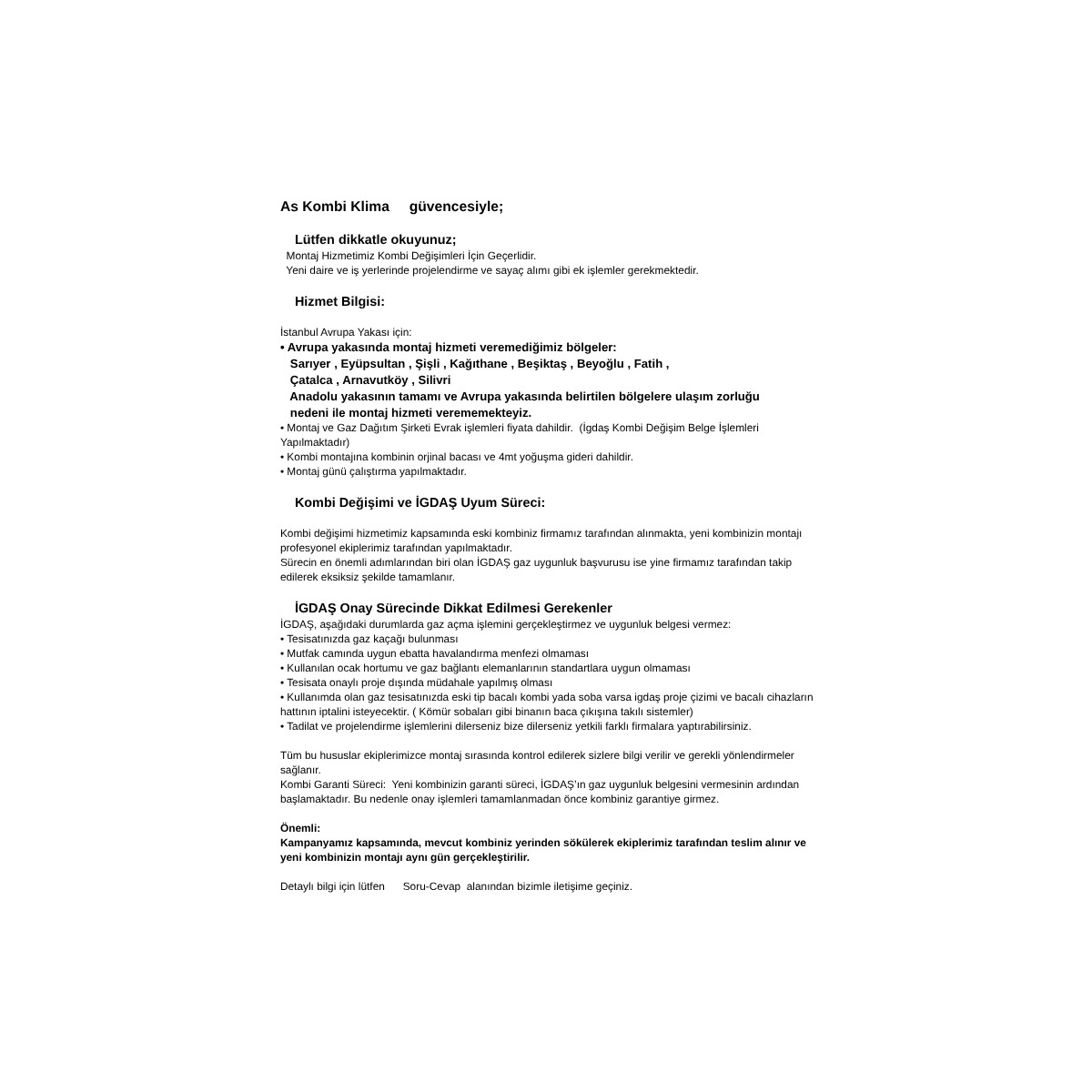 • Montaj ve Gaz Dağıtım Şirketi Evrak işlemleri fiyata dahildir. (İgdaş Kombi Değişim Belge İşlemleri Yapılmaktadır)