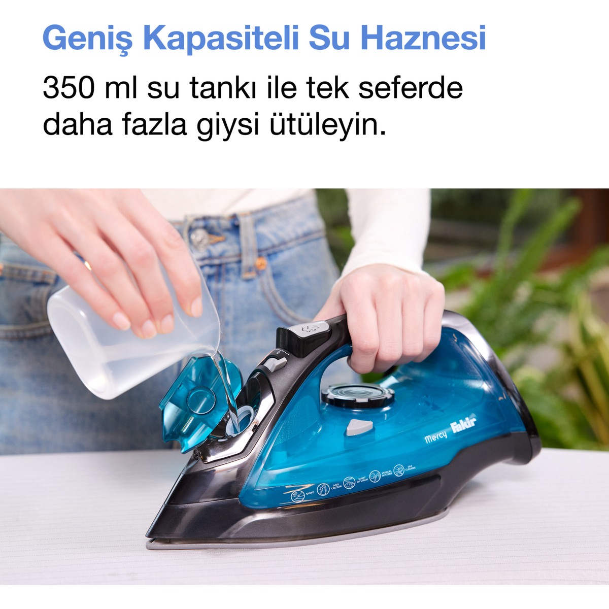 350 ml Su Tankı: Geniş su tankı kapasitesine sahip Mercy ile ütüleme işleriniz artık çok daha kolay! Geniş su tankı sayesinde ütüleme sırasında sık sık su doldurmak zorunda kalmazsınız. Tek seferde daha fazla çamaşırı ütüleyebilir, zamandan tasarruf edebilirsiniz.