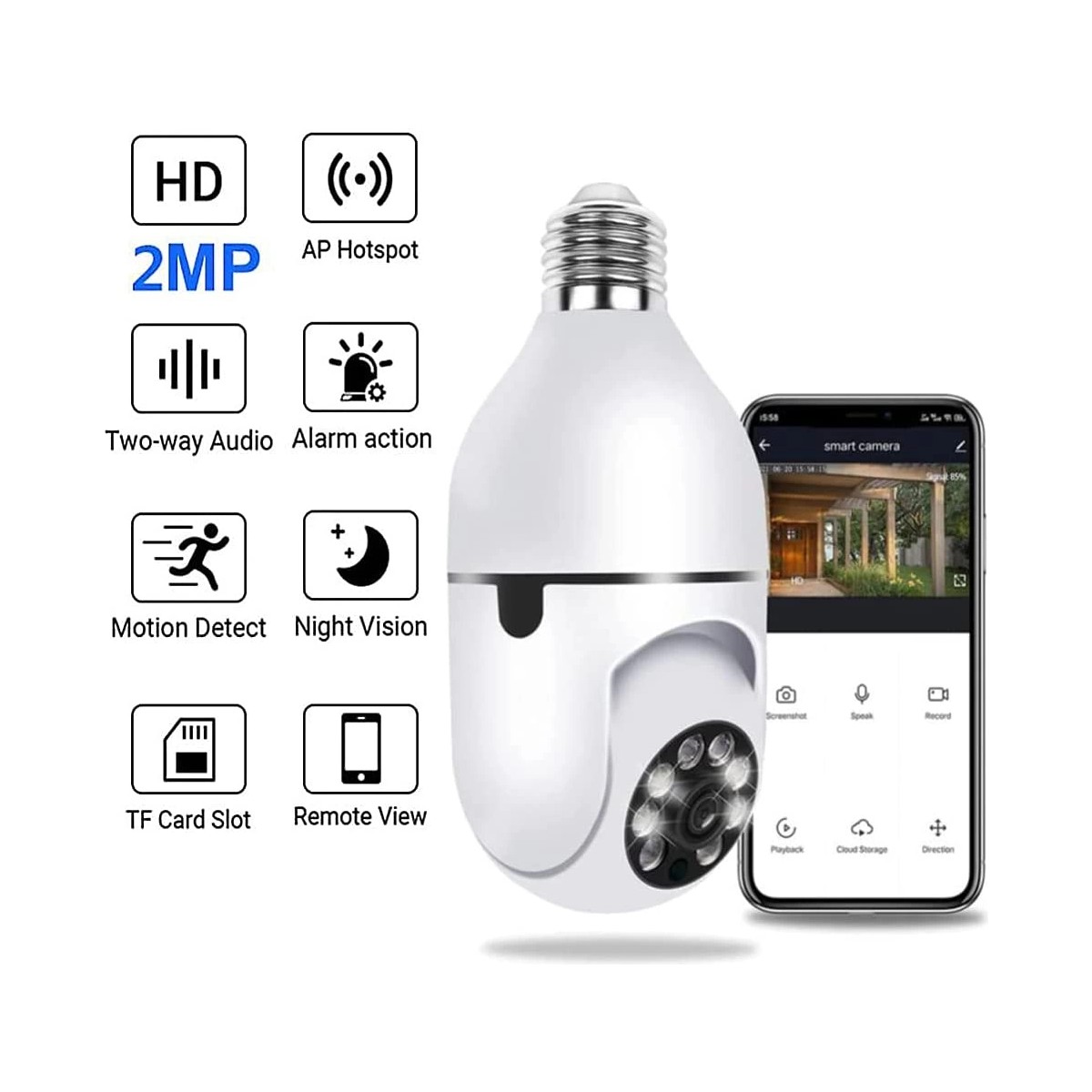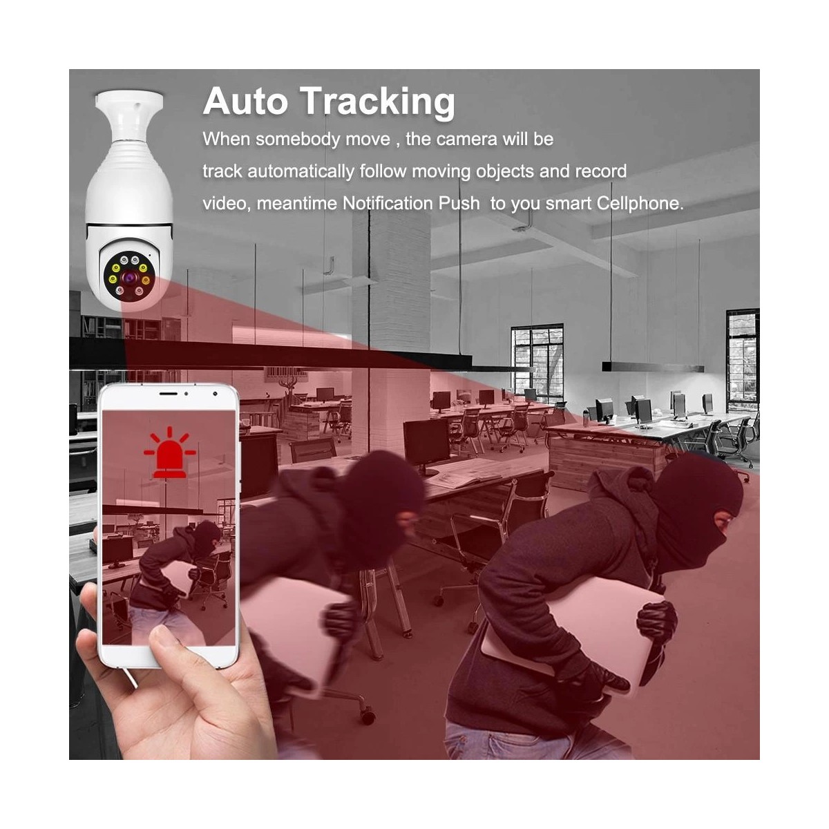 - 1080P ve Panoramik Görüntüleme: Bu ampul kamera, istediğiniz zaman net bir görüş sağlayabilir. Kör alan olmadan 360 görüntüleme elde etmek için kamerayı kontrol etmek için APP’yi kullanabilirsiniz.