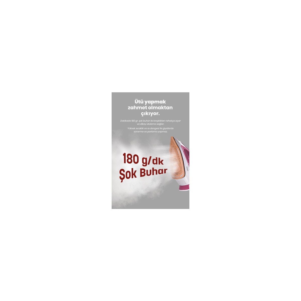 - Askıdaki elbise ve perdeleriniz için dikey ütüleme özelliği.