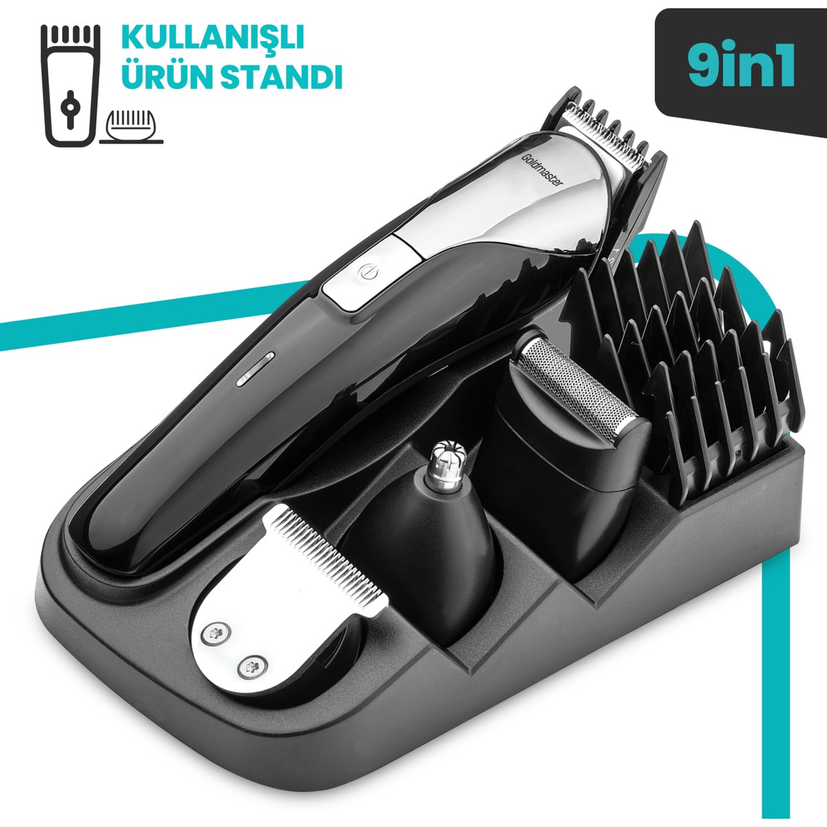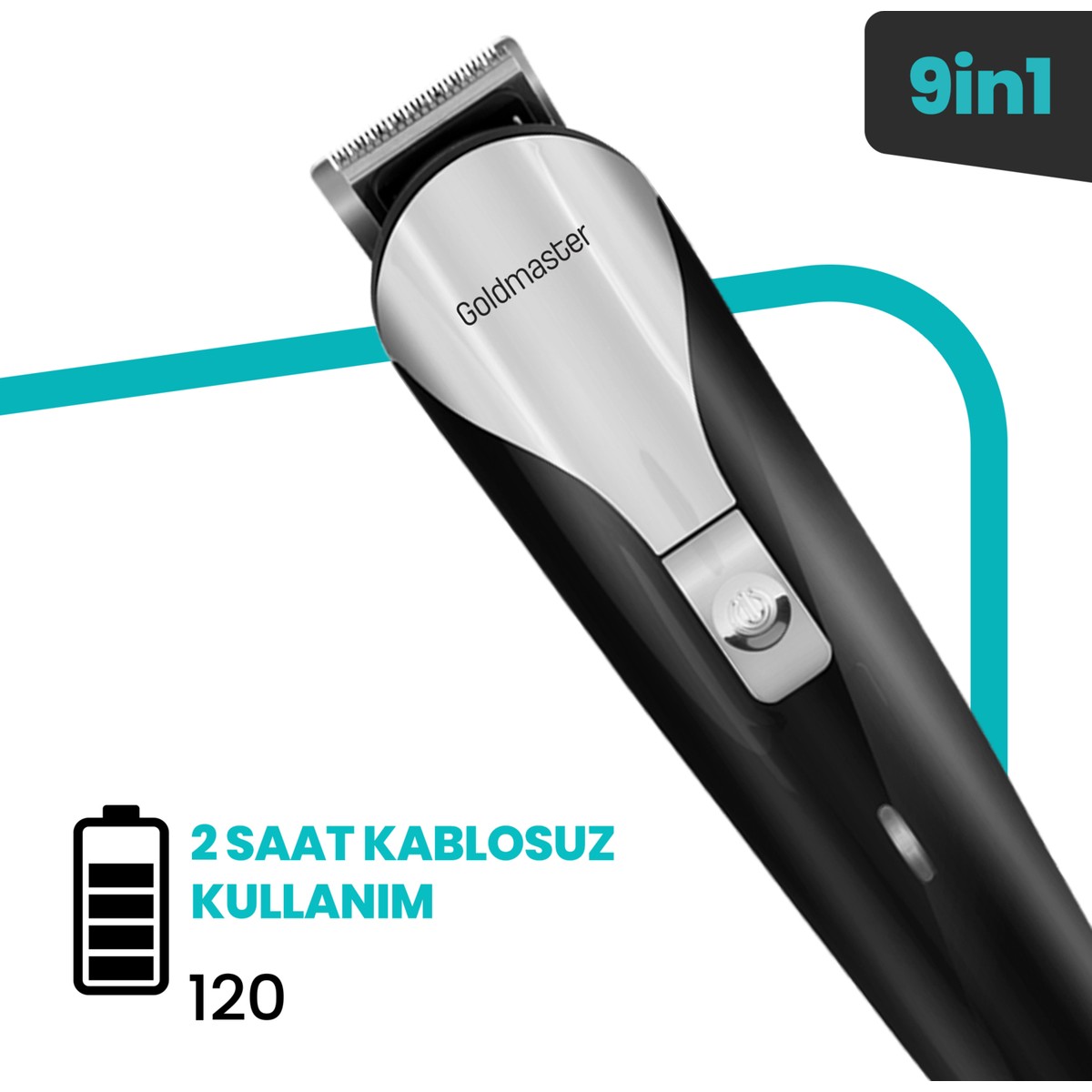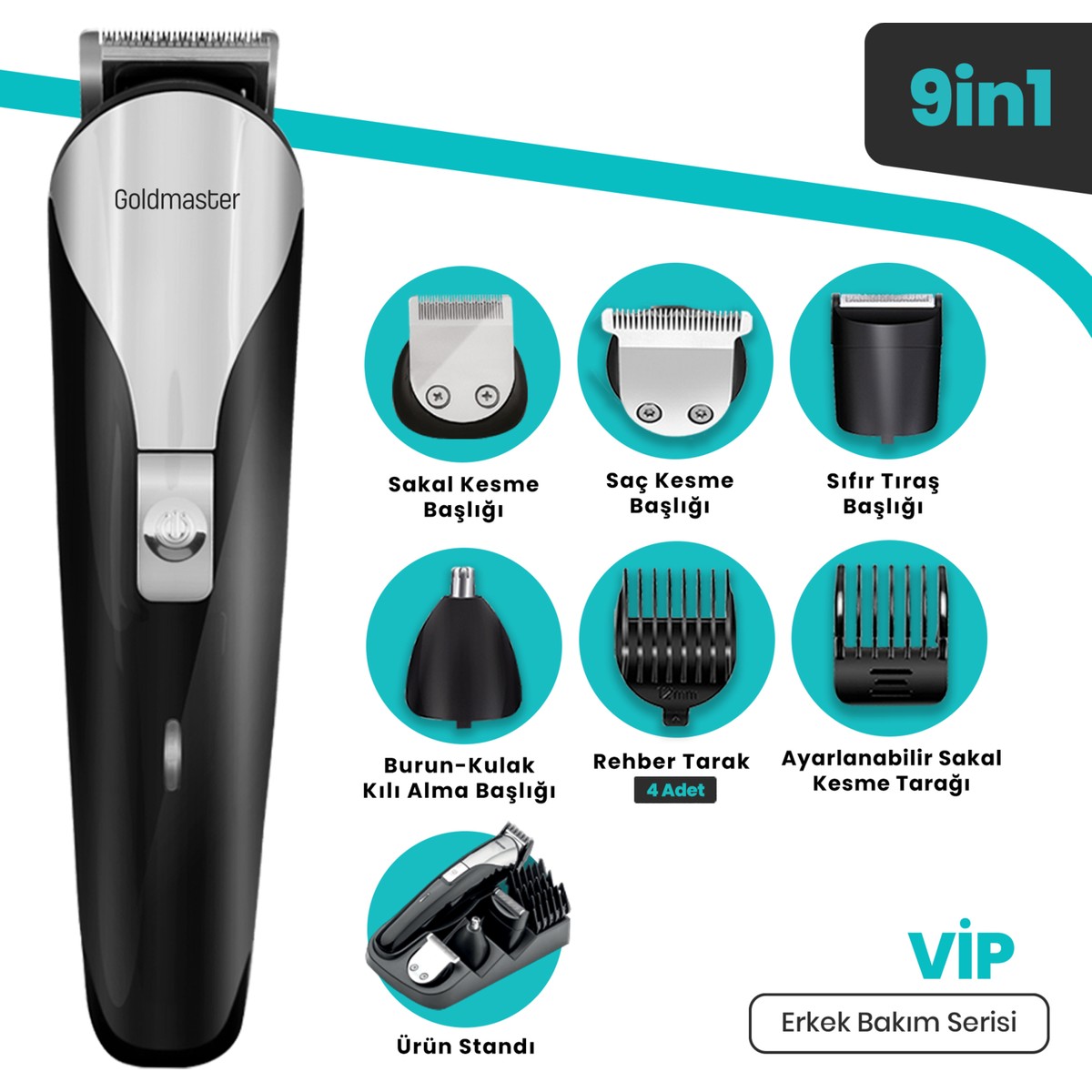 Goldmaster Vip 9’u 1 Arada Erkek Bakım ve Tıraş Seti – Folyo Başlık, Kablosuz, Hızlı Şarj, Saç ve Sakal Kesme, Siyah