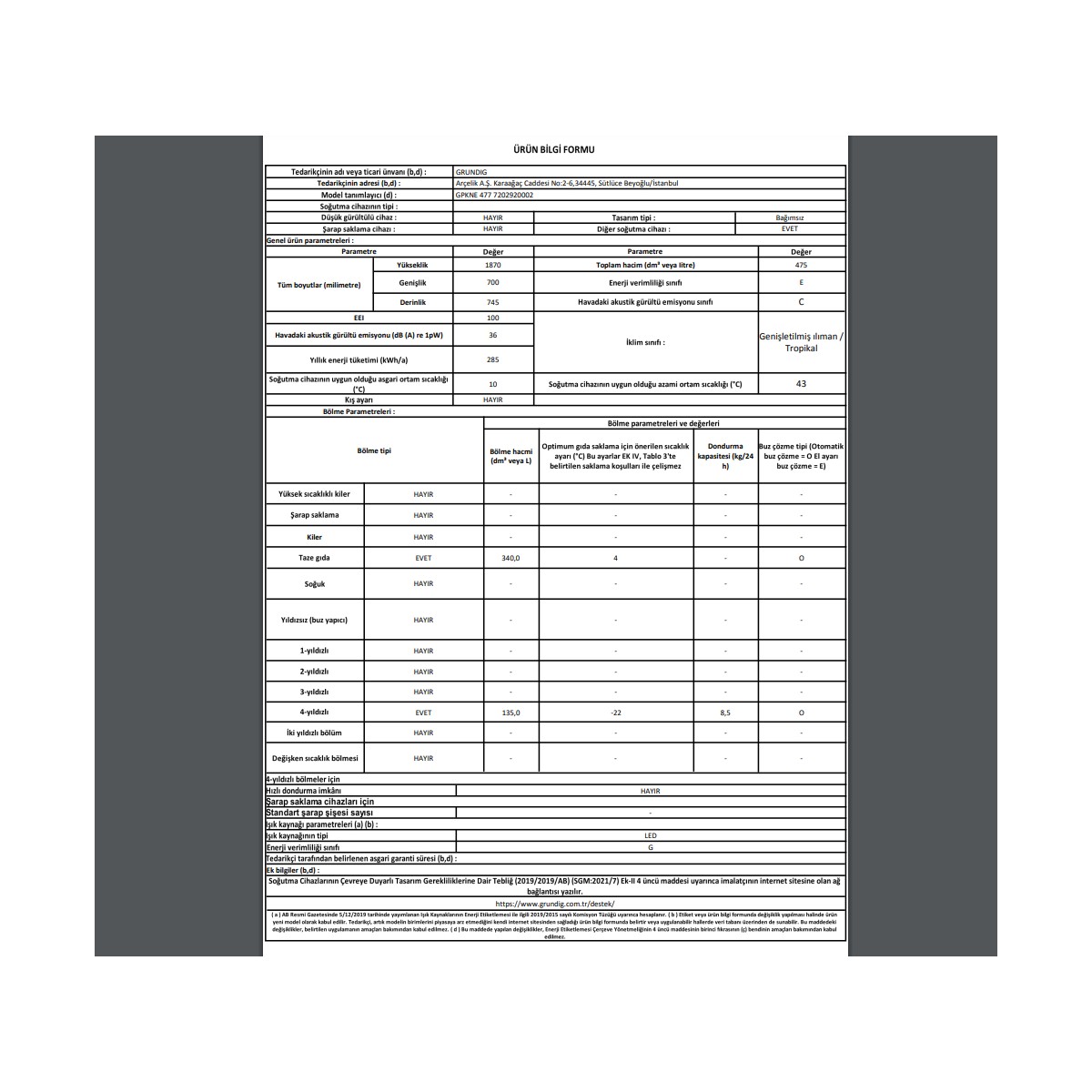 Grundig Grundıg Gpkne 477 E Enerji Sınıfı 477 L Duo-No Frost Alttan Donduruculu Buzdolabı Beyaz