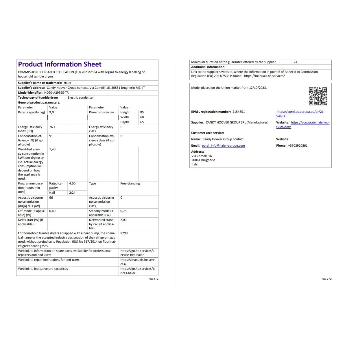 Haier HD90-A2939E-TR 9 kg Wi-Fi Bağlantılı Isı Pompalı Kurutma Makinesi