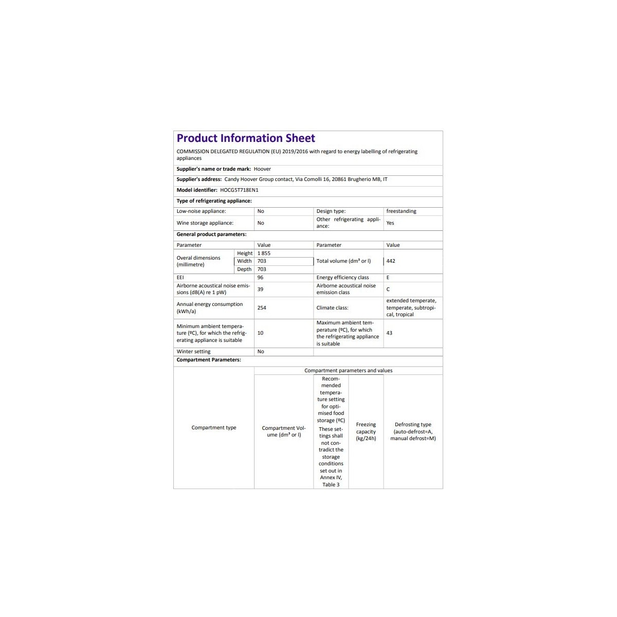 Hoover HOCG5T718EN1 E Enerji Sınıfı 442 Lt Wi-Fi Bağlantılı Kombi Tipi No Frost Buzdolabı