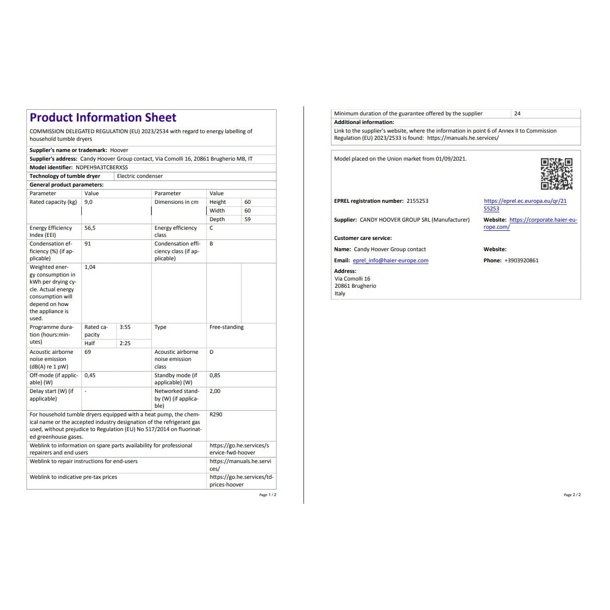 Hoover Ndpeh 9A3TCBERXSS 9 kg Wi-Fi Bağlantılı Isı Pompalı Kurutma Makinesi