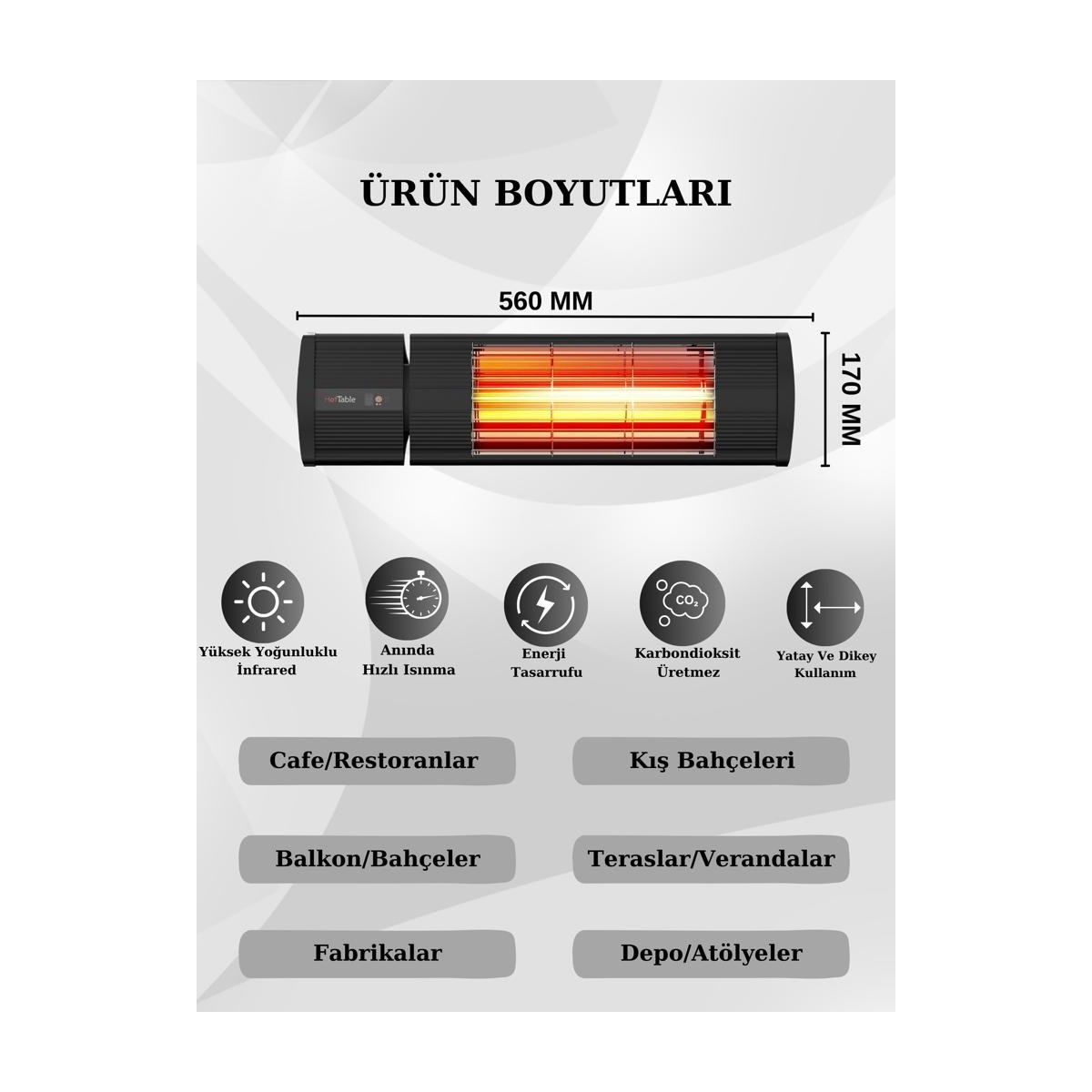 Hottable Supreme2000 Plus tüm açık alanlarda kullanıcılarının göz zevkini bozmayan, görüntü kirliliği yaratmayan, son derece şık ve estetik görünümlü bir profesyonel dış ortam ısıtıcı olarak tasarlanmıştır. Kısa dalga İnfrared teknolojisi sayesinde mekânınızı düşük maliyetler ile maksimum seviyede ısıtmanızı sağlar. Hottable Profesyonel dış ortam ısıtıcılarının tamamı, cihazı açtığınız anda etkisini göstermektedir. Kullandığı elektriğin tamamını ısıya çevirerek kısa sürede dilediğiniz ısıya ulaşmanızı sağlar. Hottable açık alan ısıtıcıları yüksek yoğunluklu İnfrared teknolojisi ile 2200 C sıcaklığa 1 saniye içerisinde ulaşan Halojen ampullere sahiptir. Anında uzak mesafe ısıtma sağlar. Su geçirmez özelliği vardır. Sert iklim koşullarında kullanılabilir. Rüzgârda sönmez. Su ve toza karşı dayanıklıdır. Karbondioksit üretmez. Şemsiye veya sundurma altı gibi noktalara kolaylıkla monte edebilir. Kurulumu ve montajı kolaydır. Yatay ve dikey açıda kullanılabilir. Askı aparatları ürün ile birlikte gönderilmektedir. Hottable Profesyonel ısıtıcılarında kullanılan tüm materyaller; uzun süre kullanıma elverişli, kararma ve paslanma yapmayan malzemelerden oluşmaktadır. 5 farklı güçte ayarlanabilen ısı seçenekleri sayesinde değişen hava koşullarına göre istenilen ısıda çalıştırılabilir. Plus özelliği olan cihazlar manuel veya uzaktan kumanda ile kontrol edilebilir. TEKNİK ÖZELLİKLER Güç : 2000W Ebatlar : 56x10x17 cm Renk : Siyah Ağırlık : 2,7 Kg Akım : 8,7 A Kumanda: Var Uygulama Alanları: Kafeler, Restoranlar, Oteller, Eğlence Mekânları, Kayak Merkezleri, Kış Bahçeleri, Bekleme Alanları, Atölyeler, Fabrikalar, Depolar, Tüm Bahçeler, Verandalar Teraslar ve Balkonlar. (Tüm açık alanlarda kullanıma uygundur.) Montaj Şekli: Duvar, Tavan, Şemsiye Altlarına Yatay veya Dikey Monte edilebilir.
