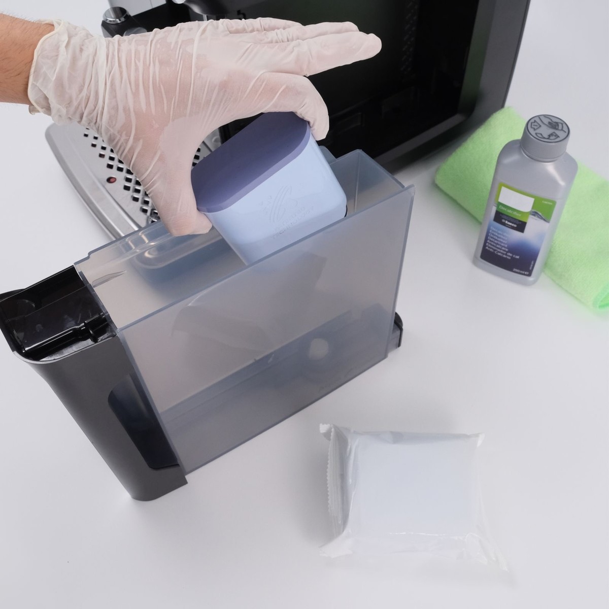 3-Cihazdaki kahve yağlarının temizliği için yağ çözücü tablet cihazın toz kahve bölümünden atılır. Cihaz kabinindeki kahve tortuları ve kahve yağı kalıntıları temizlenir. Bu sayede her kahve demlemede taze kahve elde edilir.