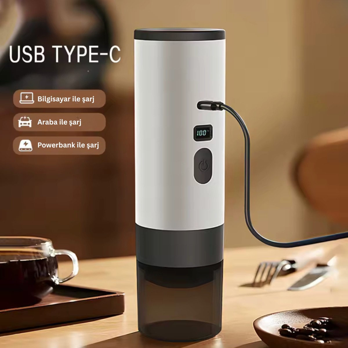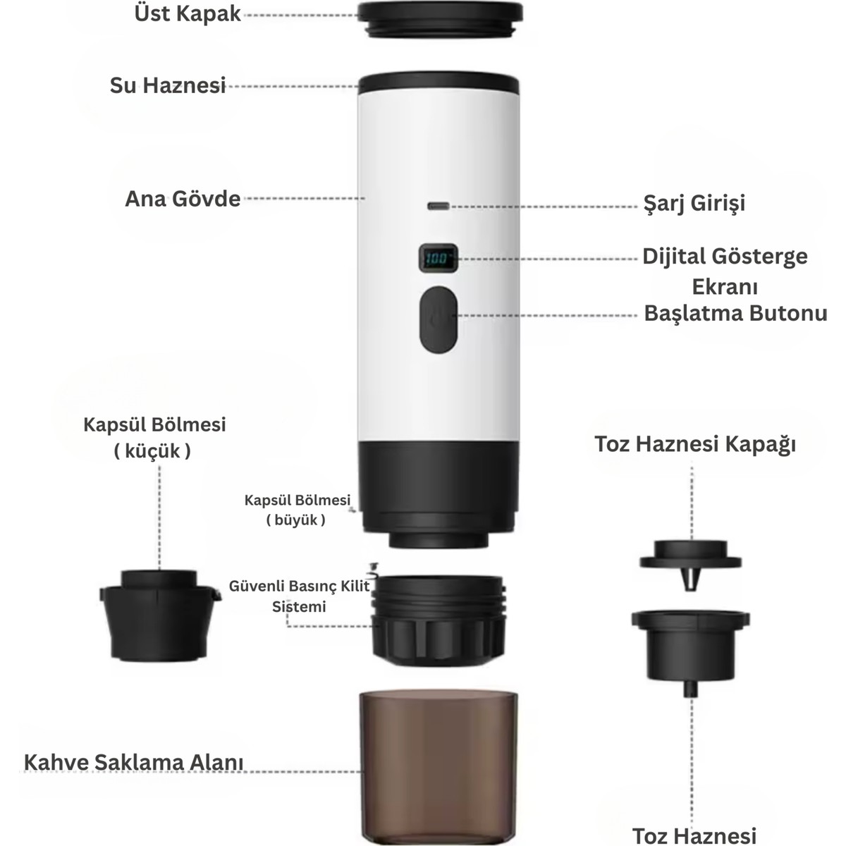 <head><meta charset=”UTF-8″></head><span style=”font-style: normal; font-variant-caps: normal; font-weight: 400; letter-spacing: normal; orphans: auto; text-align: start; text-indent: 0px; text-transform: none; white-space: normal; widows: auto; word-spacing: 0px; -webkit-text-stroke-width: 0px; text-decoration: none; caret-color: rgb(51, 51, 51); color: rgb(51, 51, 51); font-family: "Amazon Ember", Arial, sans-serif; font-size: small; background-color: rgb(255, 255, 255); float: none; display: inline !important;”>Evde, ofiste, kampta veya seyahatte taze espresso keyfi artık elinizin altında! Bu taşınabilir elektrikli kahve makinesi, kapsül veya toz kahve ile uyumludur ve 7800mAh şarj edilebilir pili sayesinde her yerde sıcak kahve sunar. Kompakt ve hafif tasarımıyla çantanızda veya valizinizde kolayca taşınabilir. 90ml su deposu ve 120ml kahve fincanı kapasitesi ile tek seferde yeterli espresso hazırlayabilirsiniz. Dijital sıcaklık göstergesi ve otomatik temizleme fonksiyonu sayesinde kullanımı basit ve pratiktir. USB üzerinden kolayca şarj edilebilir ve tek ekstraksiyon süresi sadece 80 saniyedir.</span>