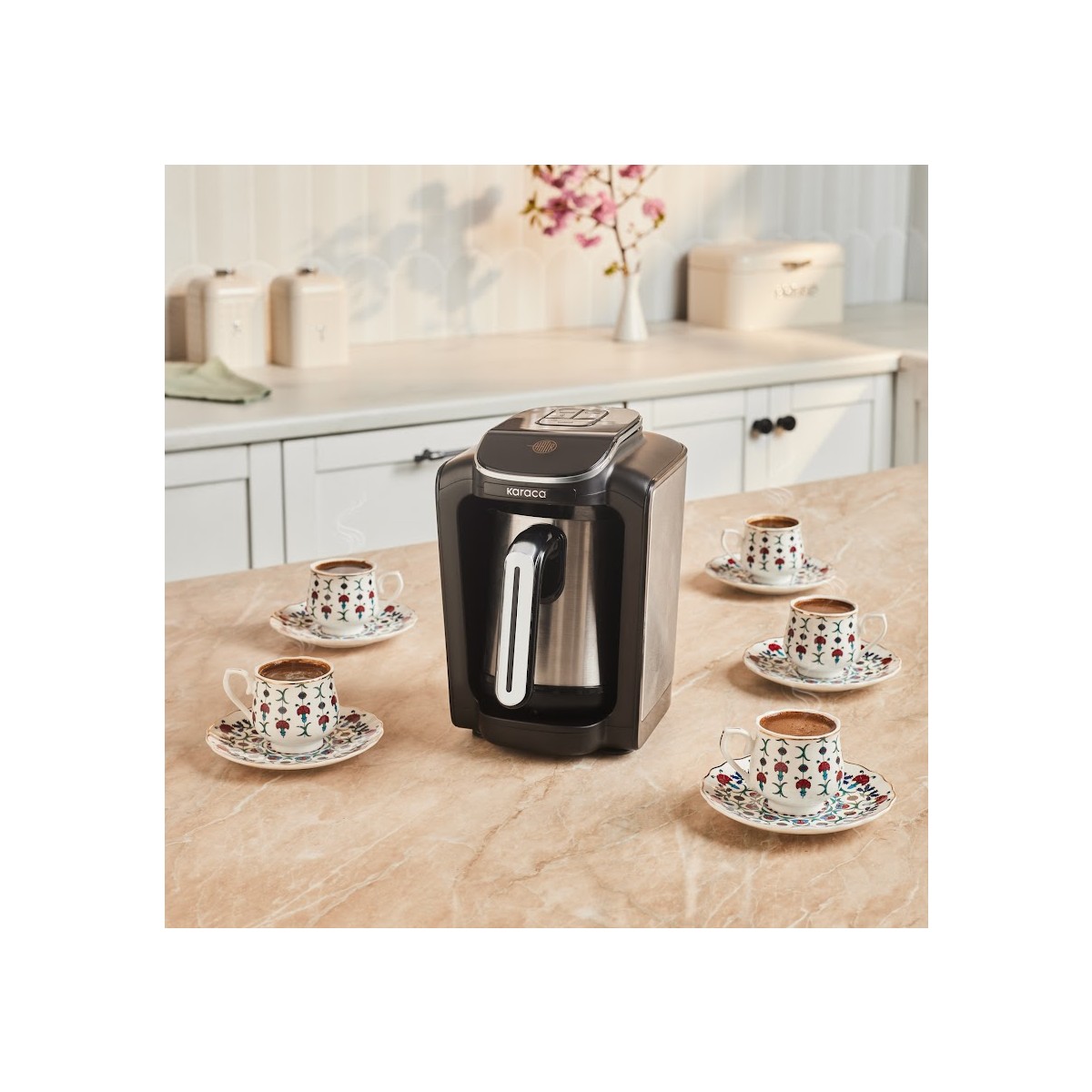 Karaca Hatır Neo Inox Çelik Cezveli Türk Kahve Makinesi ile Türk kahvesi, közde Türk kahvesi ve aromalı Türk kahvesi keyfi sizinle! Damak zevkinize göre istediğiniz 3 lezzetten birini seçerek tek seferde 5 fincan kahve hazırlayabilirsiniz. Sıcaklığını otomatik ayarlayarak kahvenizi en lezzetli şekilde pişirir. Özel ölçü kaşığı ise her pişirmede bol köpüklü mükemmel kıvamı yakalamanızı sağlar. Sesli ve ışıklı uyarı sistemi, pişirme tamamlandığında size haber verir; böylece makinenin başında beklemenize gerek kalmaz. Sahip olduğu taşma önleyici sensör ve otomatik kapanma fonksiyonuyla güvenli bir kullanım sunar.