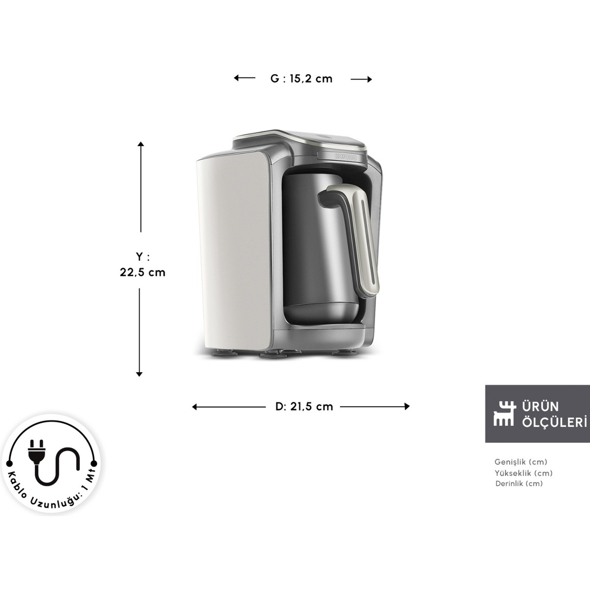 Karaca Hatır Neo Türk Kahvesi Makinesi ile Türk kahvesi, közde Türk kahvesi ve aromalı Türk kahvesi keyfi sizinle! Damak zevkinize göre istediğiniz 3 lezzetten birini seçerek tek seferde 5 fincan kahve hazırlayabilirsiniz. Sıcaklığını otomatik ayarlayarak kahvenizi en lezzetli şekilde pişirir. Sesli ve ışıklı uyarı sistemi, pişirme tamamlandığında size haber verir; böylece makinenin başında beklemenize gerek kalmaz. Sahip olduğu taşma önleyici sensör ve otomatik kapanma fonksiyonuyla güvenli bir kullanım sunar.
