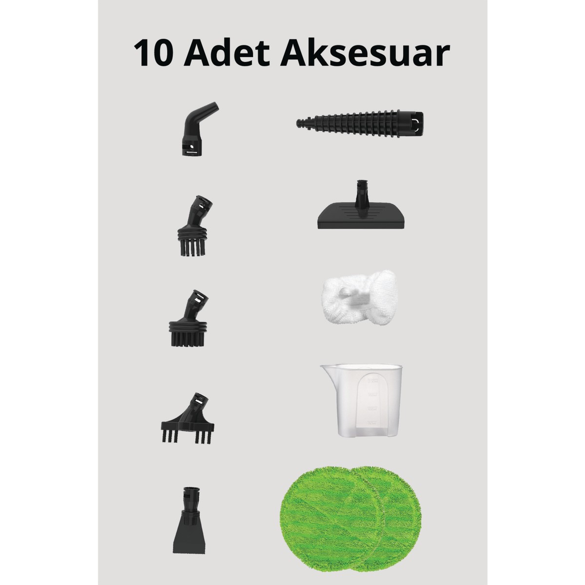 6. Aksesuarlar; Dairesel çift malzemeli paspas pedi, Kavisli başlık, Büyük yuvarlak fırça, Dar alan temizleme, Cam kazıyıcı, Kazıyıcı başlık, Küçük yuvarlak fırça, Havlu seti, Doğrudan inanma, Ölçüm kayıtları