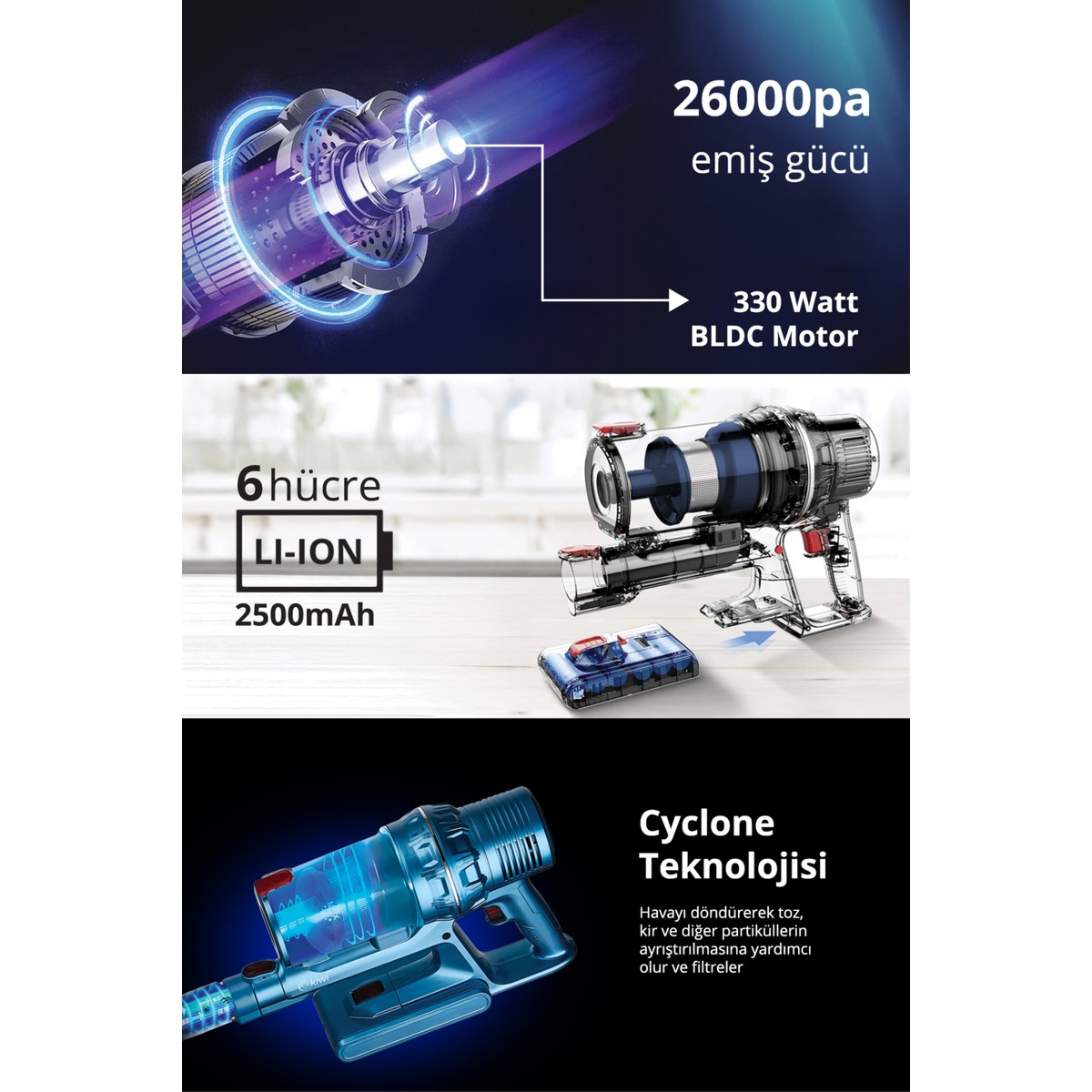 - Güçlü emiş için siklon teknolojisi. 2’si 1 arada el tipi ve dikey kullanım.