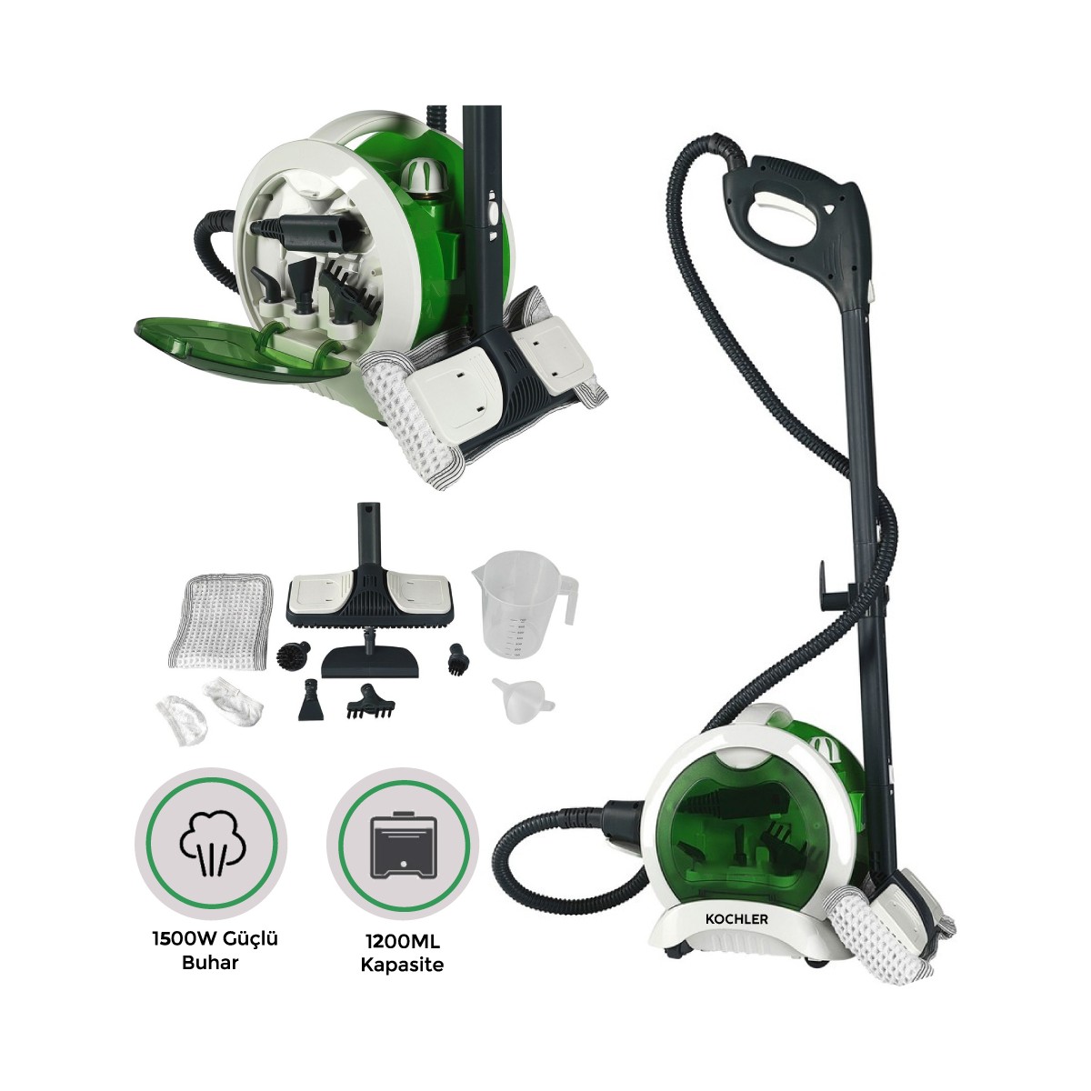 Kochler Buharlı Temizlik Makinesi, güçlü 1500W motoru ve geniş 1200 ml su haznesiyle mutfak, banyo ve zeminlerde etkili ve hijyenik temizlik sağlar. Kimyasal kullanmadan derinlemesine temizlik imkânı sunan bu cihaz, farklı yüzeyler için özel başlıkları sayesinde çok yönlü kullanım sunar.