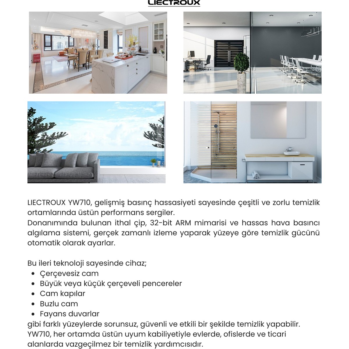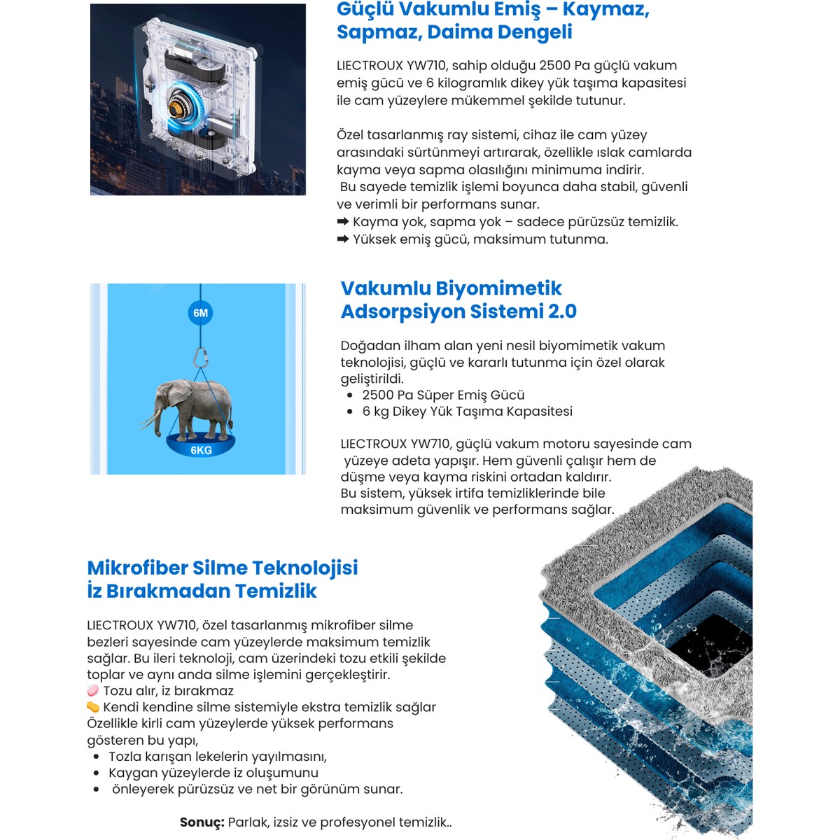 Liectroux YW710, modern evler ve işyerleri için geliştirilmiş akıllı cam temizleme robotudur. Yenilikçi tasarımı, güçlü motor sistemi ve güvenlik özellikleri ile cam temizliğini kolay, hızlı ve güvenilir hale getirir.