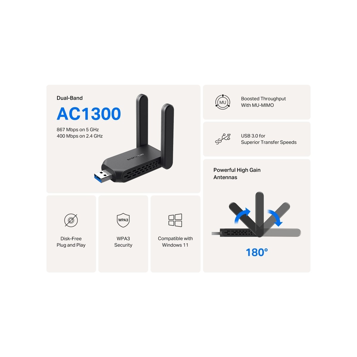 Mercusys MA32H, AC1300 Mbps, Çift Bant, USB 3.0, Yüksek Çekim Güçlü Wi-Fi 5 USB Adaptör