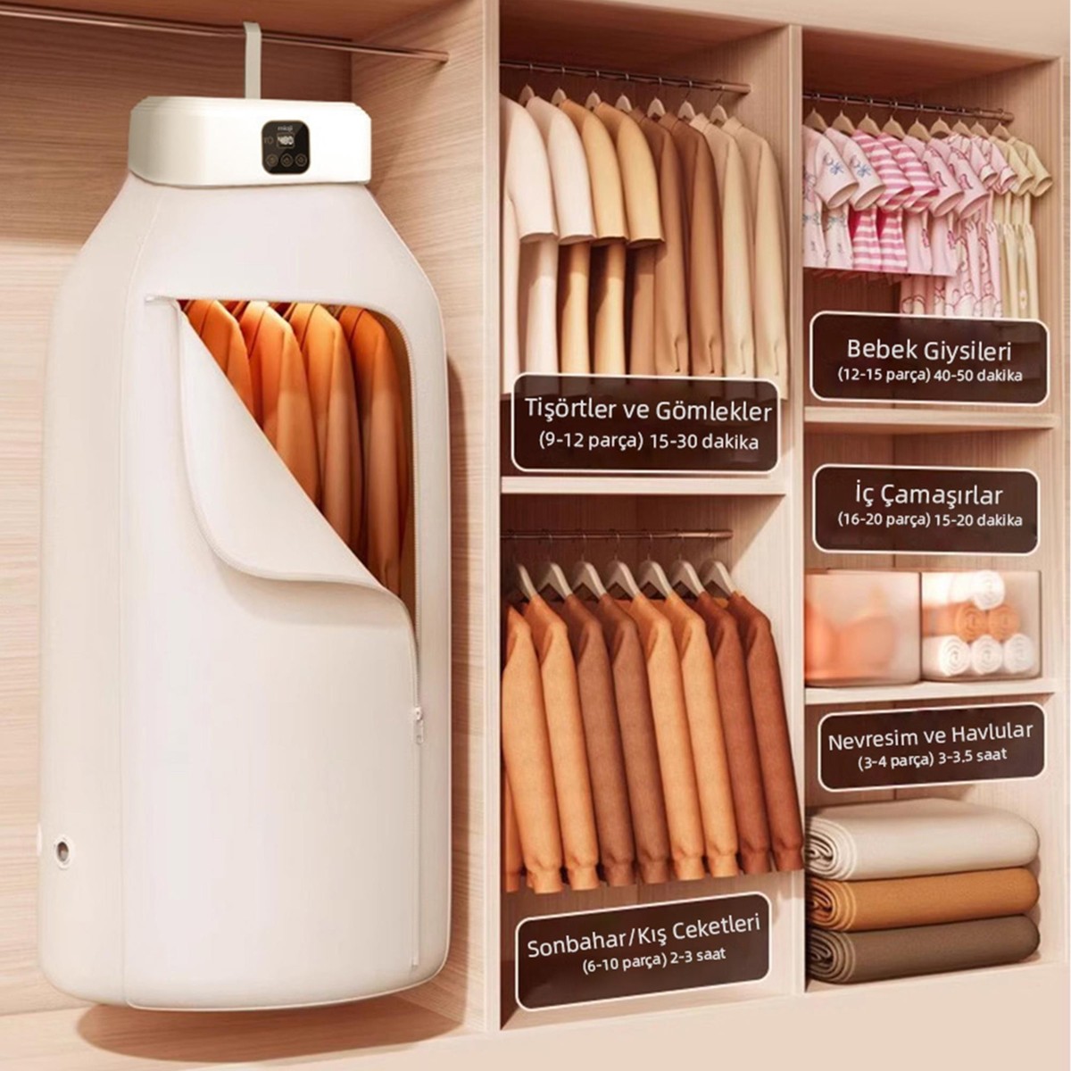 Ürün özenli paketleme ve hasarsız elime ulaştı. Giysi kılıfı daha kaliteli olabilirdi. Görseldekinden biraz daha farklı ,astar kumaşı gibi. Kılıf montajlı geliyor. Kullanıma hazır halde.Süre klavuz takip edilirse kolaylıkla ayarlanıyor. 60dk yı denedim gayet memnun kaldım. Giysinin kumaşı kalınlığı oslaklığına göre, asılan askı sayısına göre kurutma süresi ayarlanması önemli.Kurutma sırasında oluşacak koku buhar vs için banyoda kullanmayı planlıyorum. Duşakabinin kapılarını yana kaydırınca kabinin üst çerçevesine kolaylıkla astım. Kurutmasından da memnun kaldım. Klavuzda belirtilmemiş ama her ihtimale karşı evdeki plastik askılarımda sıcak havadan dolayı bozulma olursa diye metal askı kullandım.Kurutmadan verim almak için giysileri tek tek askılamak lazım.