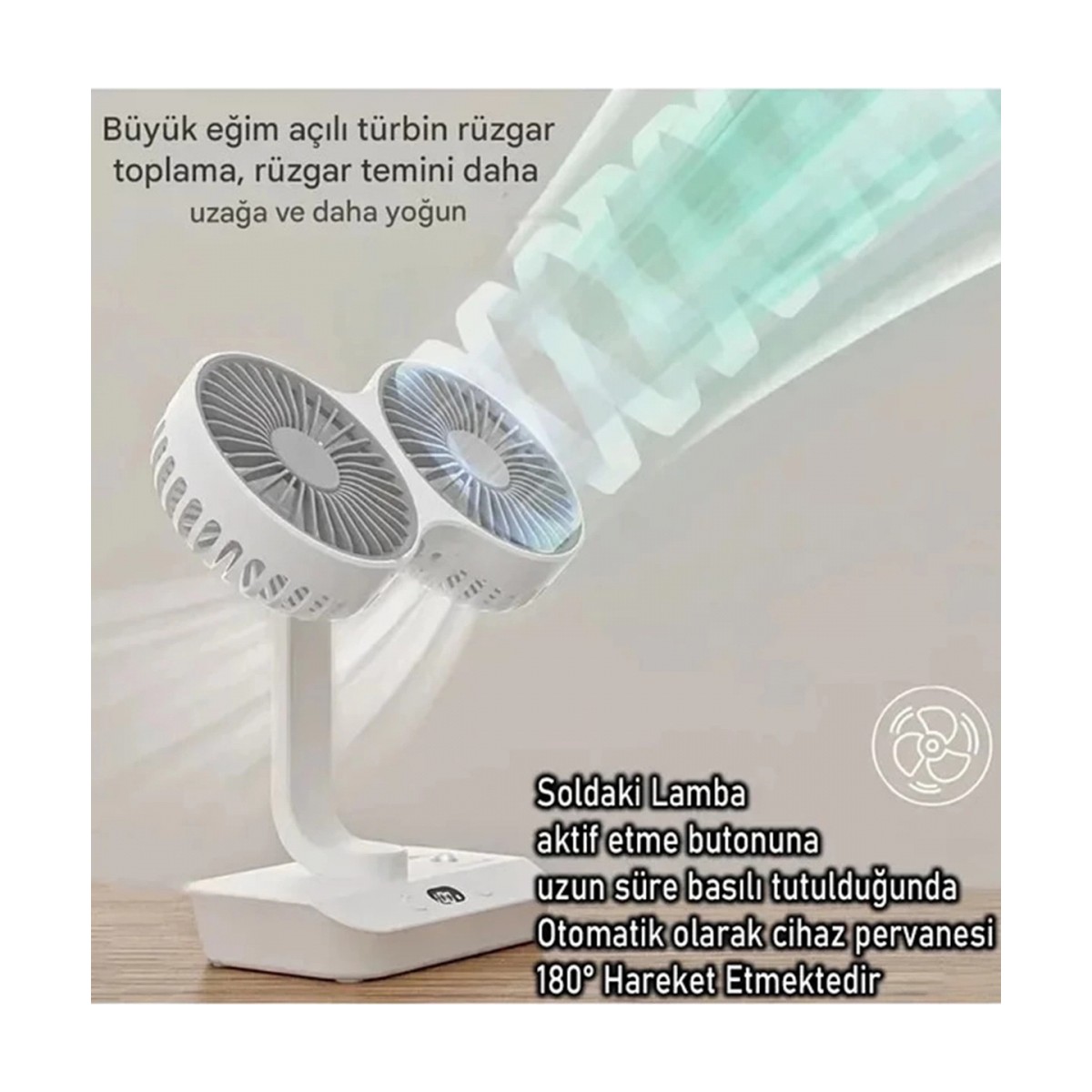 【Sessiz】: Kişisel vantilatör, sessiz fanı sayesinde sessiz çalışır ve ofisler veya yatak odaları gibi sessiz ortamlarda kullanıma uygundur.