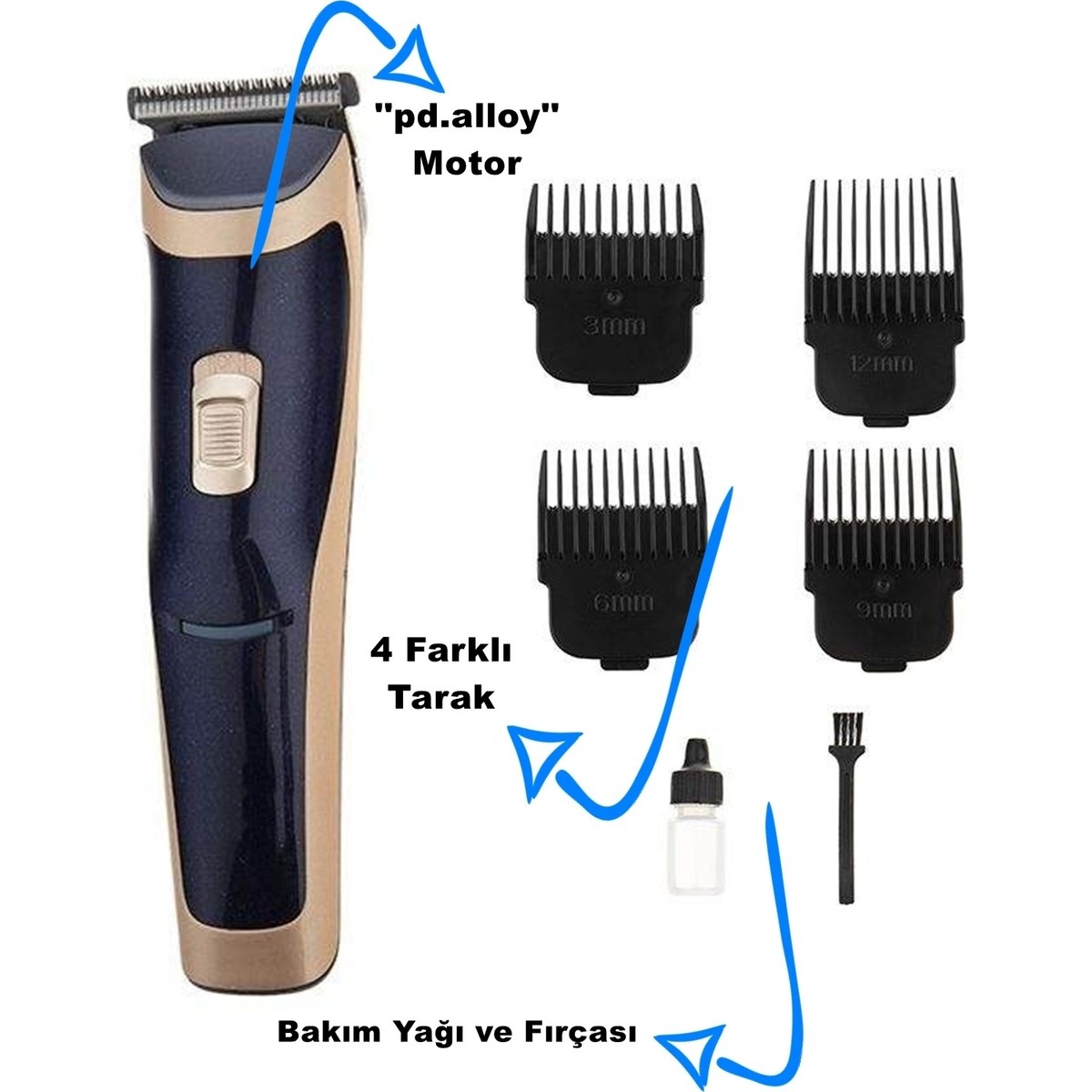 modanlı Turbo 4×4 TR-650 Profesyonel Saç Sakal Tıraş Makinesi Bu Traş Makinesi Size Pahalı Markaların Sunduğu Performansı Sunar. Özellikler: -Saç ve Sakal Kesiminde Mükemmel Performans -Gümüş “pd.alloy” Motor Sayesinde En Sık ve Sert Saç&Sakallarda Bile Çekme Yolma ve Yığılma Yapmaz -Keskin Çelik Bıçakları Dayanıklı ve Uzun Ömürlüdür -Yüksek Devir Gücü İle Sorunsuz Tıraş -Sessiz ve Titreşimi Optimize Edilmiştir -Taraksız Kullanımda Sıfıra Yakın Kesim Sağlar -Kavisli Ergonomik Yapısı Sayesinde Kolay Kavranır -Bakım ve Temizlik İçin Bıçakları Kolay Bir Şekilde Çıkartılabilir KUTU İÇERİĞİ: 1 ADET ŞARJLI TRAŞ MAKİNESİ TARAKLAR 1 ADET 12mm 1 ADET 9mm 1 ADET 6mm 1 ADET 3mm 1 ADET ŞARJ ADAPTÖRÜ 1 ADET TEMİZLİK FIRÇASI 1 ADET BAKIM YAĞI Temizlik ve Bakım: Makinenin uzun ömürlü olması için bıçaklarını kullanım yoğunluğuna göre düzenli bir şekilde yağlayınız.Öncelikle her kullanımdan sonra kutu içerisinde bulunan temizlik fırçası ile makinenizin bıçaklarında ki saç-sakal artıklarını temizleyiniz.Uzun süreli kullanımdan (1-2 ay) sonra detaylı temizlik için çelik bıçağın arkasındaki 2 adet vidayı sökünüz ve fırça ile temizliği tamamladıktan sonra uygun kısımları yağlayarak tekrar takınız.Makinenizi suya yada yağa yatırmayınız ve yıkamayınız.Kozmetik temizliği için nemli bez kullanınız.Temizlik aşamasında çözücü ve ovucu maddeleri kullanmayınız.