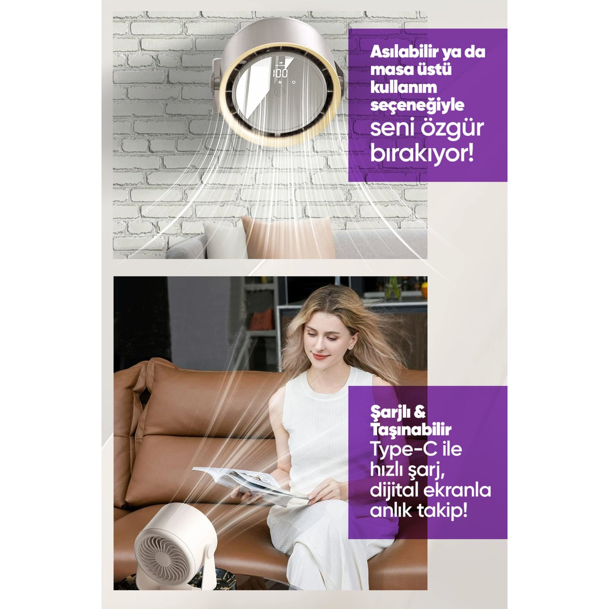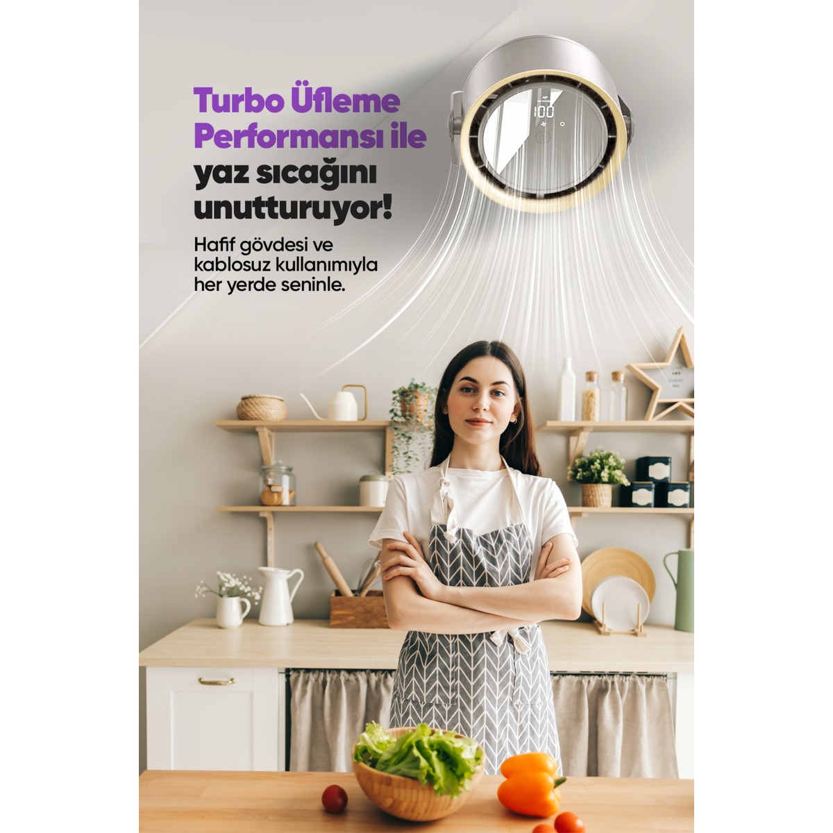 Şarjlı Turbo Masa Fanı Duvara Monte Edilebilir, Yüksek Üfleme Gücü, 5 Kademe Ayarlanabilir Hız