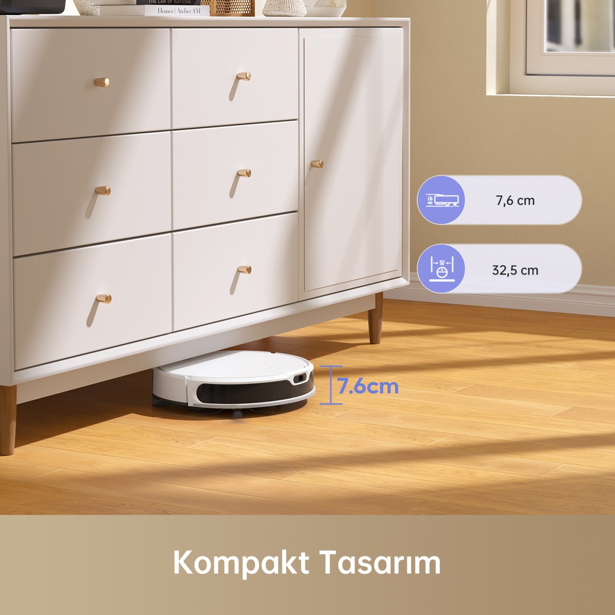 7.6 cm yüksekliğinde ve 32.5 cm çapında şık gövdesi, mobilyaların altından ve dar alanlardan sorunsuzca geçiş yapacak şekilde özel olarak tasarlandı, böylece hiçbir toz topakları gizli kalmaz. Ergonomik yapısı, yalnızca temizlik yapmakla kalmayıp, kanepelerin ve sehpa altlarının sık sık gözden kaçırılan yerlerine de ulaşmayı vaat ediyor.