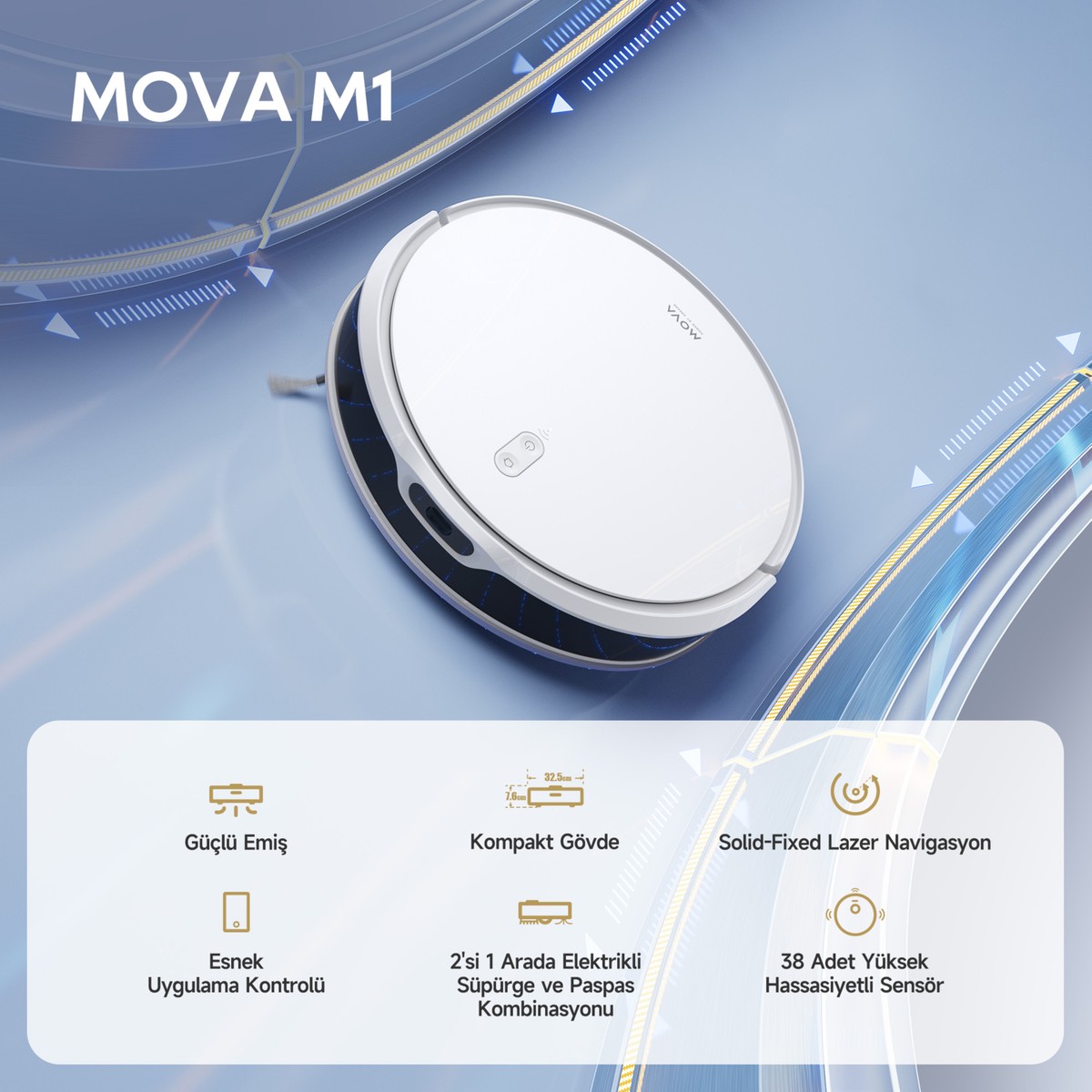 Mova M1 robot süpürge ile tertemiz bir evin keyfini çıkarın; güçlü 4,500Pa* emiş gücü ve şık tasarımıyla tüm yüzeylerdeki kirleri temizlemek için tasarlandı ve her köşeye ulaşarak sizin için minimum çaba ile kapsamlı bir temizlik sağlıyor.