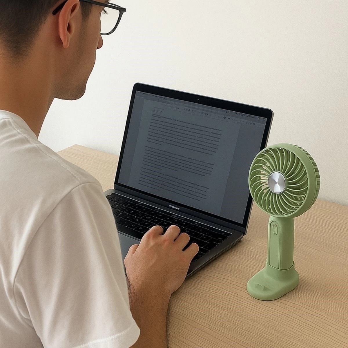 Katlanabilir standı sayesinde masa üstünde dengeli durur, çalışırken, ders çalışırken ya da makyaj yaparken eller serbest serinlik sağlar.