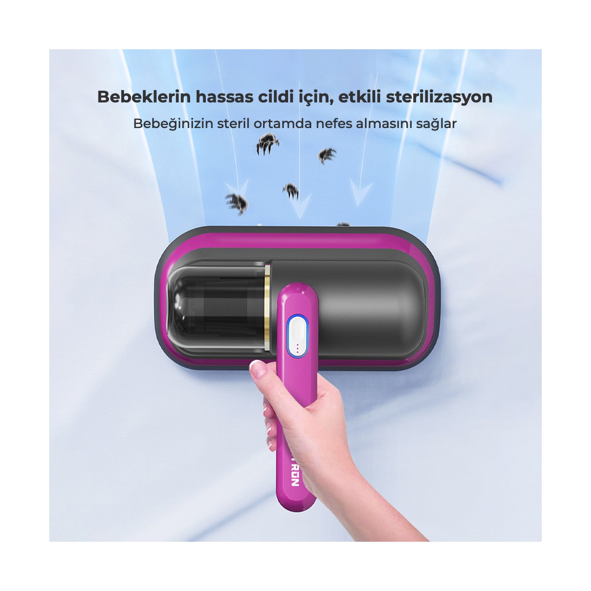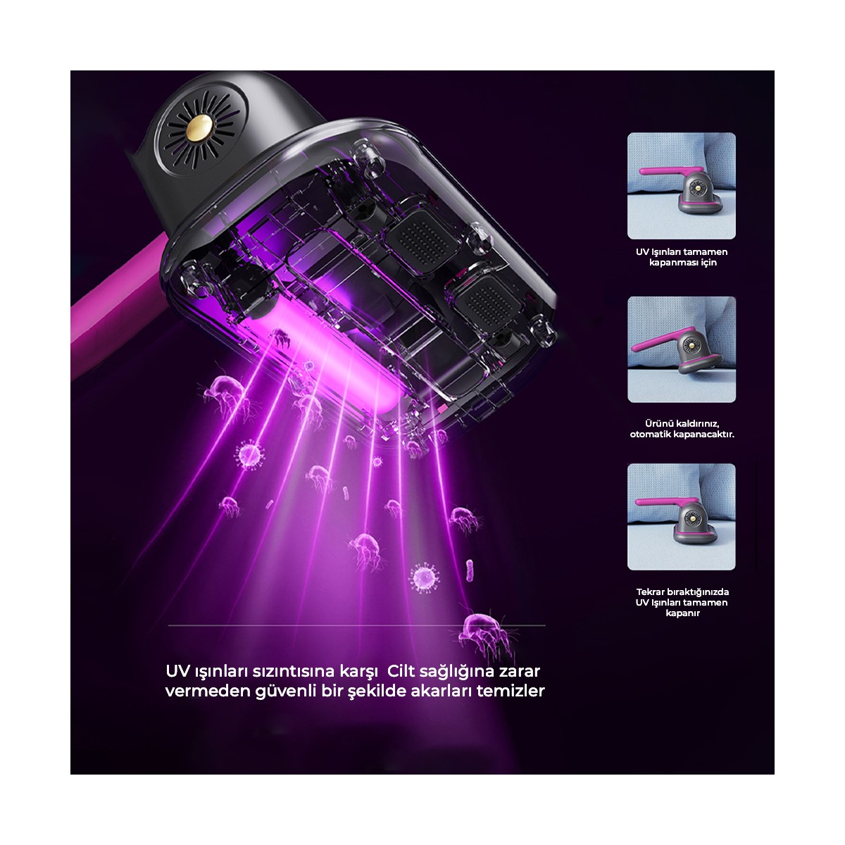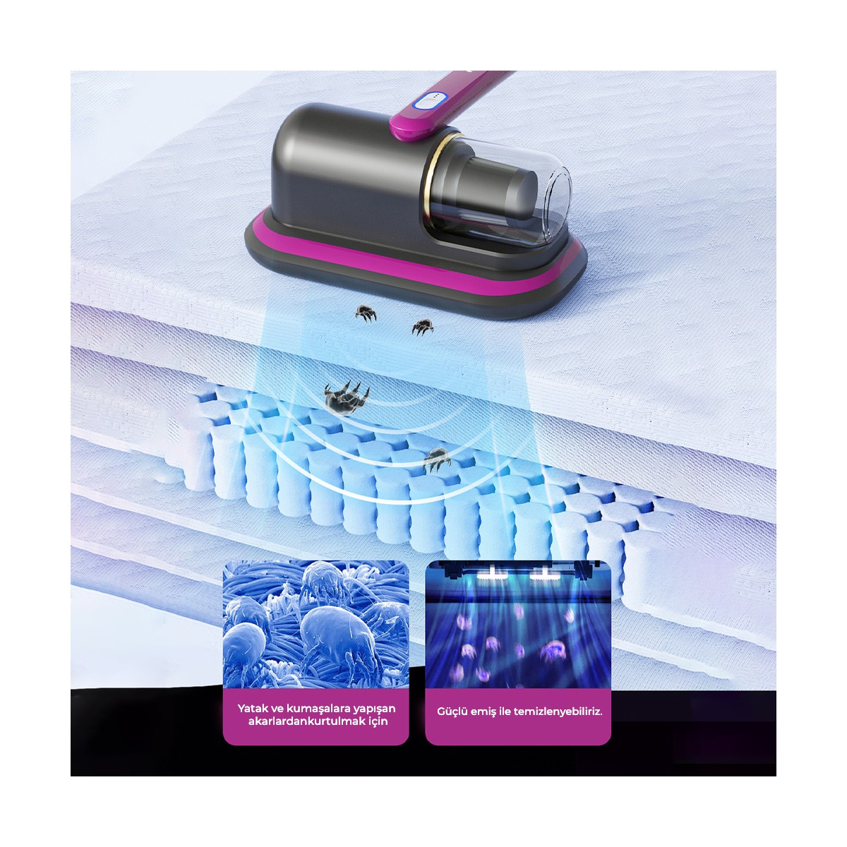 Alerjik ya da temiz bir alan isteyen herkesin elinin altında! Yataklardan ya da diğer nesnelerden bakteri, toz veya akarları etkili bir şekilde temizleyen UV sterilizasyon lambası sayesinde uyku kalitenizi arttırın! Evcil hayvan tüylerinizi artık daha kolay temizleyebilirsiniz. Kablosuz ve UV-C ışınları yardımıyla mikropları toplar. Hızlı ve etkili sterilizasyon için  UV-C ultraviyole ışınları ile yüzey tabakasına nüfuz eder.