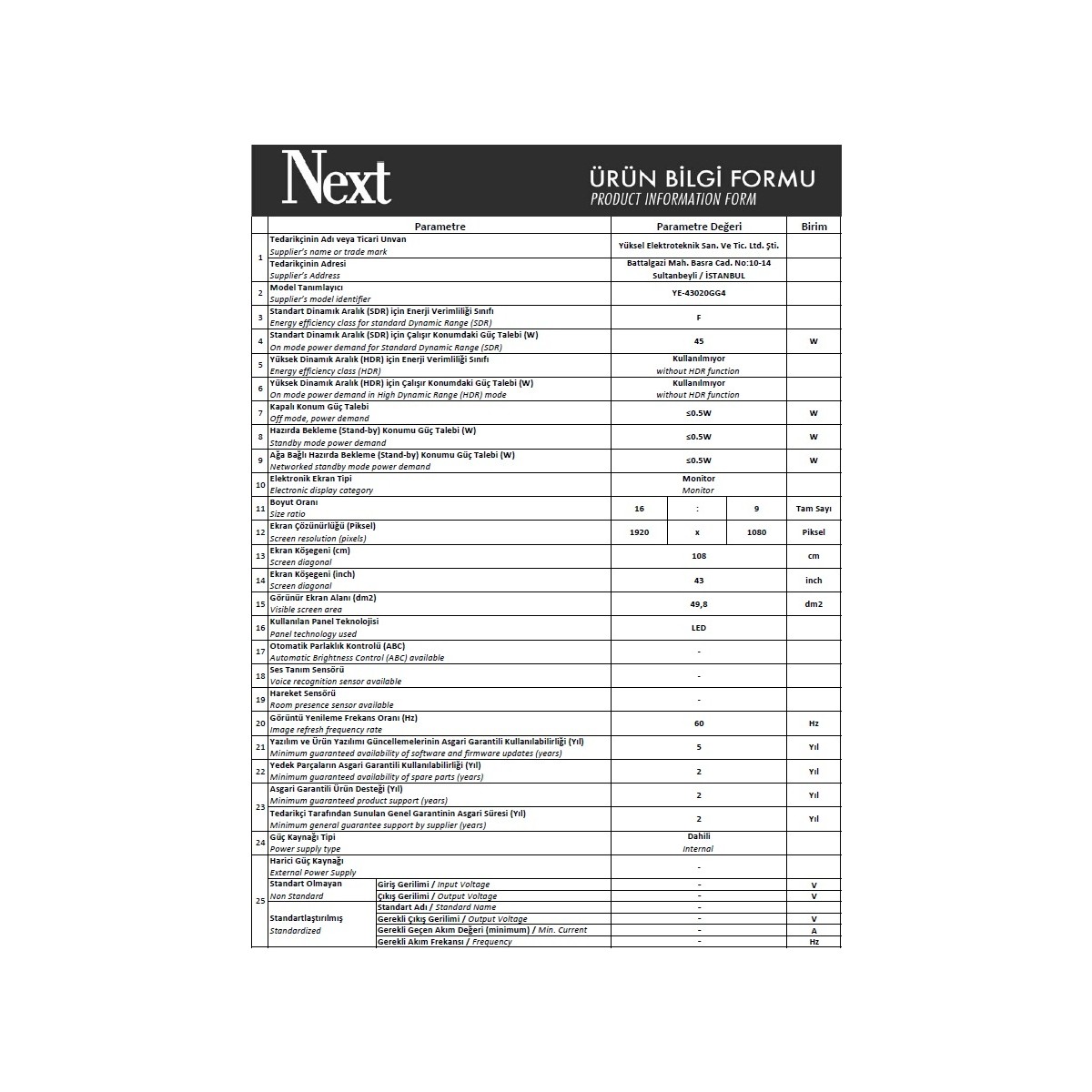 Next YE-43020GG4 43″ 109 Ekran Uydu Alıcılı Full HD Smart LED TV