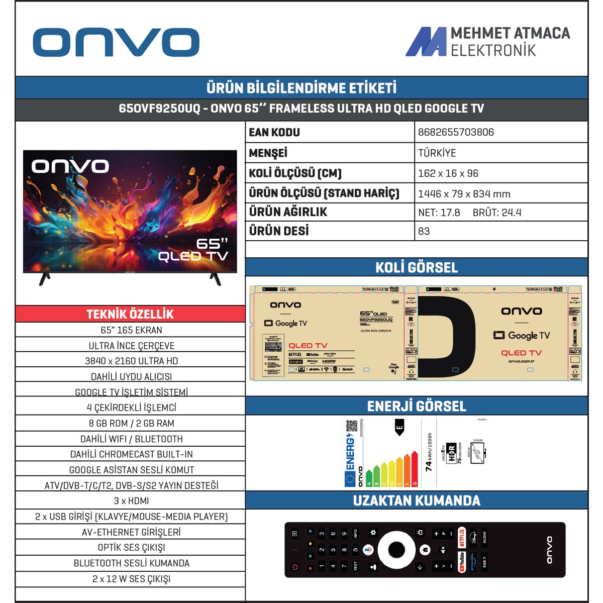 Onvo 65OVF9250UQ 65″ 165 Ekran Uydu Alıcılı 4K Ultra HD Google Smart QLED TV
