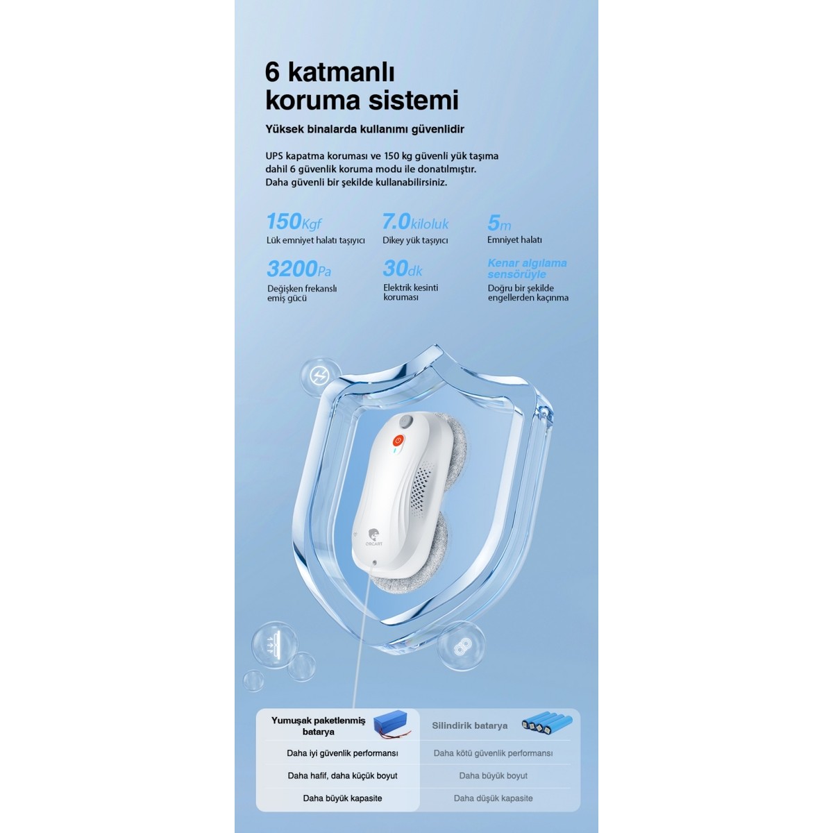 UPS güç kesintisi koruması ve 150 kg yük taşıma kapasitesi dahil altı koruma özelliği. Entegre lityum polimer pil, bağlantı kopsa bile 20+ dakika emiş gücü sağlar – yüksek katlarda güvenlik garantisi.