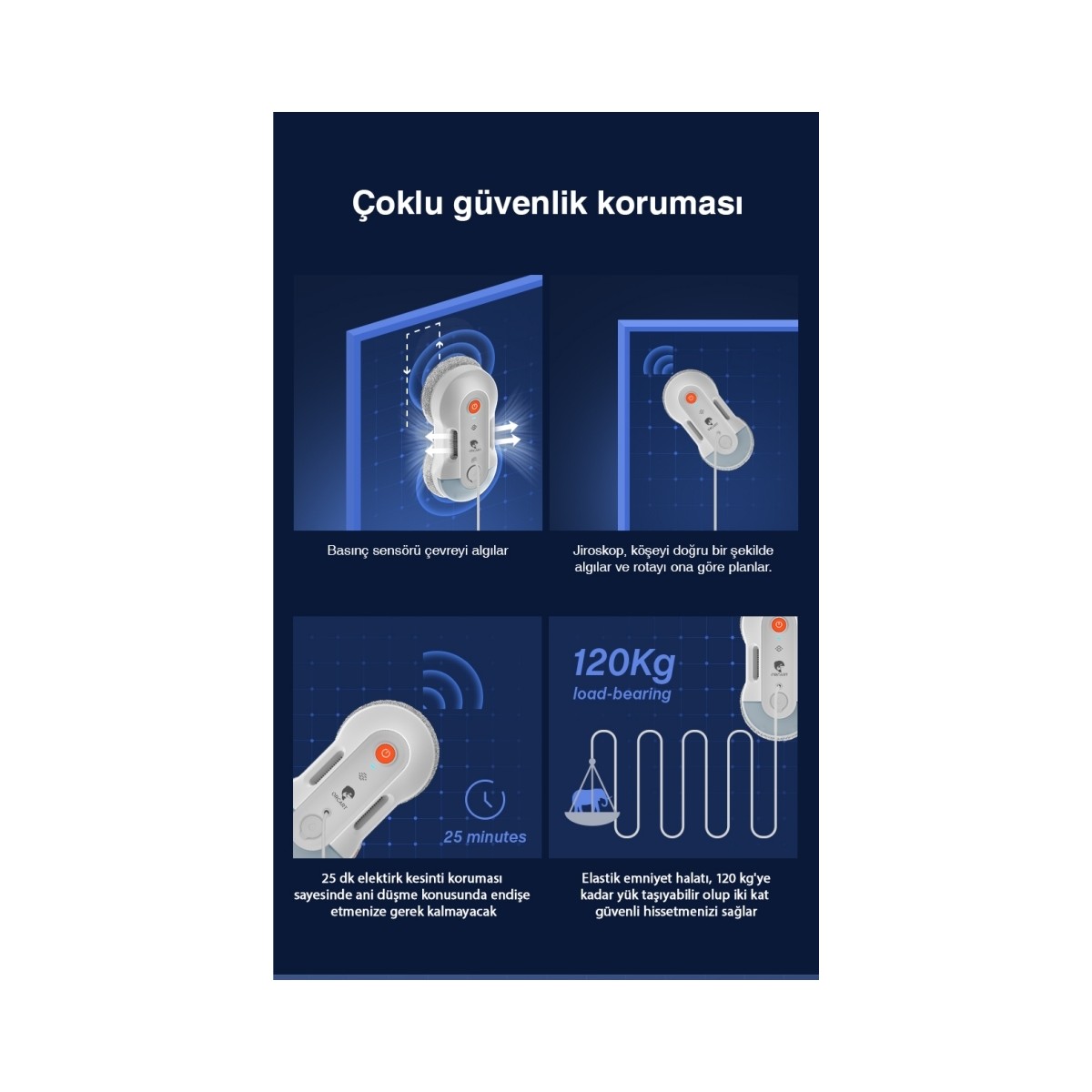 150 kg GripForce yapışma gücü, 25 dakikalık acil durum bataryası (650 mAh) ve dört sensörlü düşme önleyici sistemle tam güvenlik sağlayarak yüksek katlı binalarda güvenli kullanım sunar.