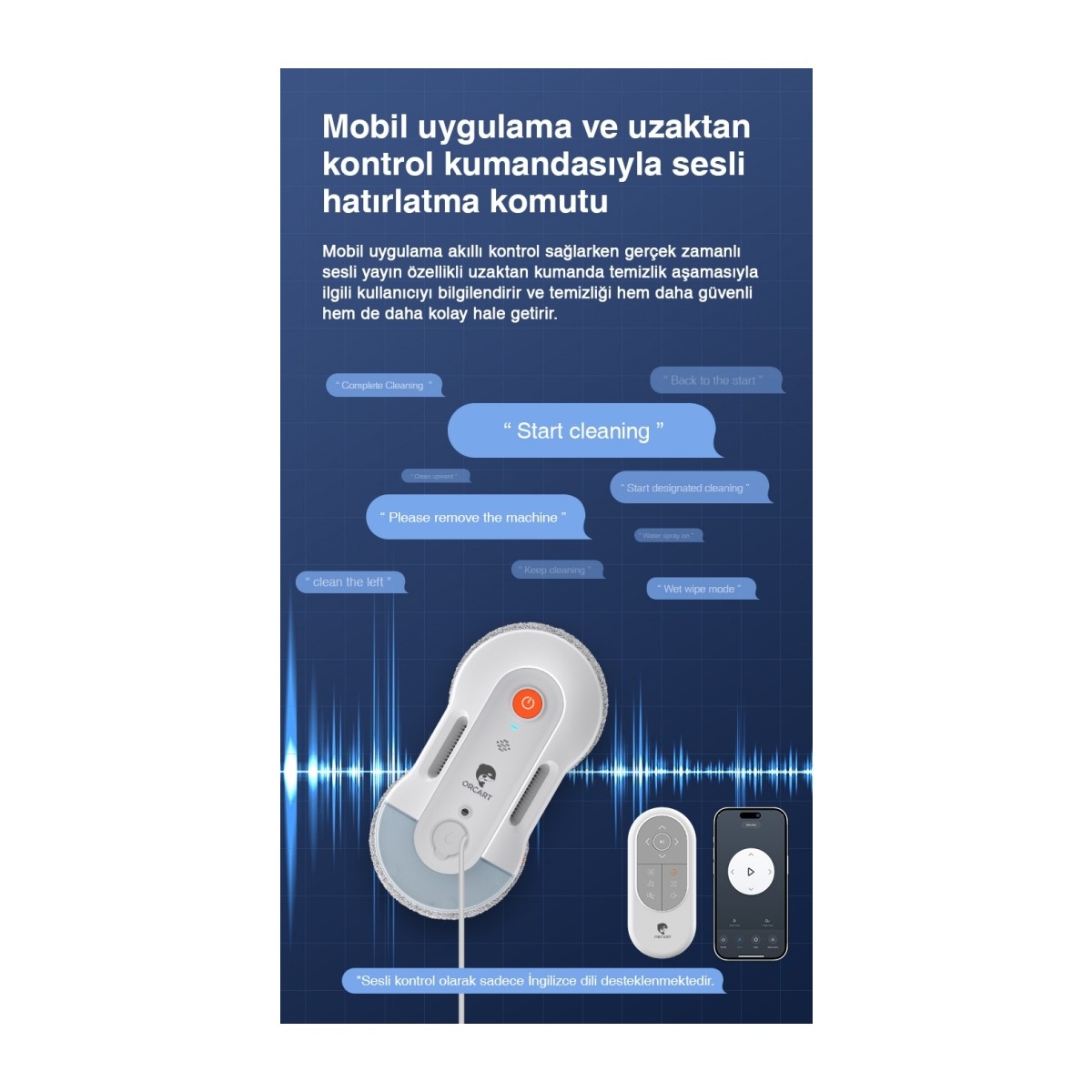 Gerçek zamanlı kir analiziyle emiş gücünü (3800Pa’ya kadar) dinamik ayarlarken, cam kenarlarını eşzamanlı tarayarak yüksek verimli yay şeklinde temizlik yörüngesi ™ oluştururSesli Bildirimli Akıllı Kontrol Sistemi: