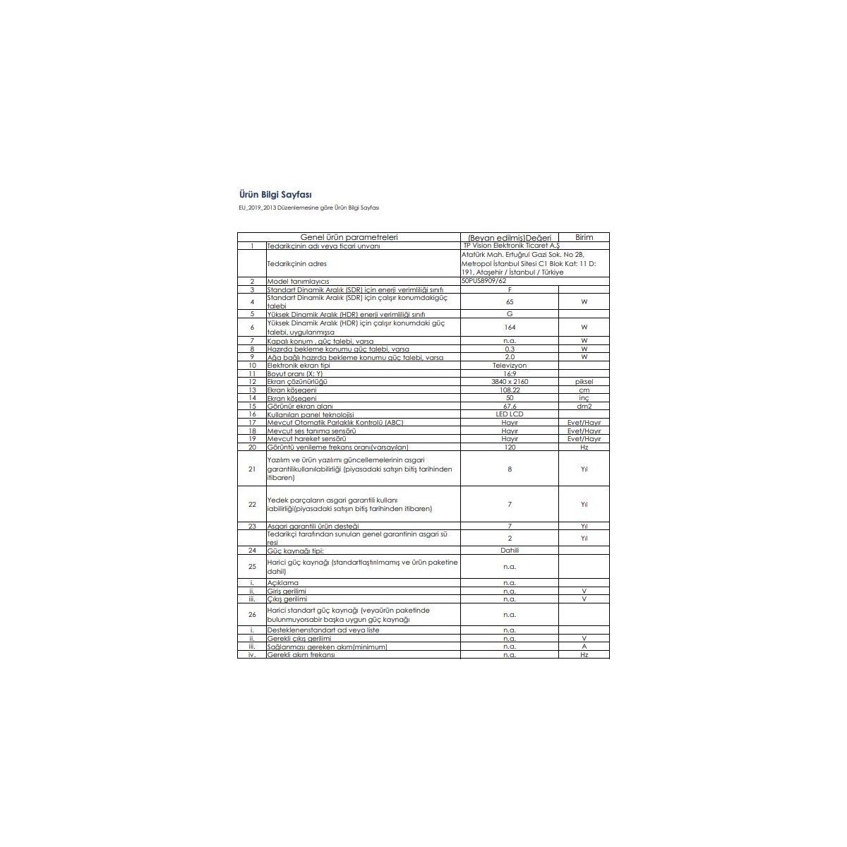 ÖZELLİKLER Ürün Tipi UHD TV 4K Görüntü kalitesi 4K UHD Ekran Boyutu 139 cm / 55 inç İşletim Sistemi Tizen Standsız boyutlar (G/Y/D) 123 cm / 72 cm / 8.1 cm SMART TV Evet İşlemci P5 Ekran Tipi LED HDR Tipi Dolby Vision Çözünürlük 3840 x 2160 Görüntü Oranı 16:9 LED Teknolojisi LED LCD HDR (Yüksek dinamik aralık) Hdr10 / Hdr10+ Compatible / Dolby Vision / Hlg Parlaklık 500 Dahili Uydu Alıcı Evet Ambilight aydınlatma Evet Ses Çıkışı 40w (2x10w+2x10w) Bağlantılar Hdmi-vrr Freesync Premium, 3 Hdmi, 2 Usb HDMI Konnektörleri 3 USB bağlantı sayısı 2 Bluetooth Evet WİFİ Evet Renk (Üreticiye Göre) Antrasit Gri Çerçeve, Antrasit Gri Stand Kutu İçeriği Uzaktan Kumanda, 2 X Aaa Pil, Masa Üstü Stant Standlı boyutlar (G/Y/D) 123 cm / 78.4 cm / 28.7 cm Standsız Ağırlık 15.5 Standlı Ağırlık 18.1 Standlı Genişlik 123 Standlı Yükseklik 78.4 Standlı Derinlik 28.7 Renk (temel) Gri Standsız Genişlik 123 Standsız Yükseklik 72 Standsız Derinlik 8.1 Ambalaj Boyutu 136 cm / 89 cm / 16 cm Üretici Garantisi 2 Yıl Türk Philips Garantili Üretim Yeri Çin Ambalaj Genişliği 136 Ambalaj Yüksekliği 89 Ambalaj Derinliği 16 Çevre Ölçüsü 346 cm Ambalajlı Ağırlık 24 Ekran Boyutu (inç) 55 Ekran boyutu(cm) 139 Enerji Verimliliği Sınıfı (EU 2017/1369) F Energy efficiency class Color Code (EU 2017/1369) RGB – 236 102 8 AB Enerji Verimliliği Ölçeği (EU 2017/1369) A-G SDR Modunda Güç Tüketimi (kWh/1000h) 69 Enerji Verimliliği Sınıfı (HDR) G HDR Modunda Güç Tüketimi (kWh/1000h) 180 Ekran Yenileme Hızı 120
