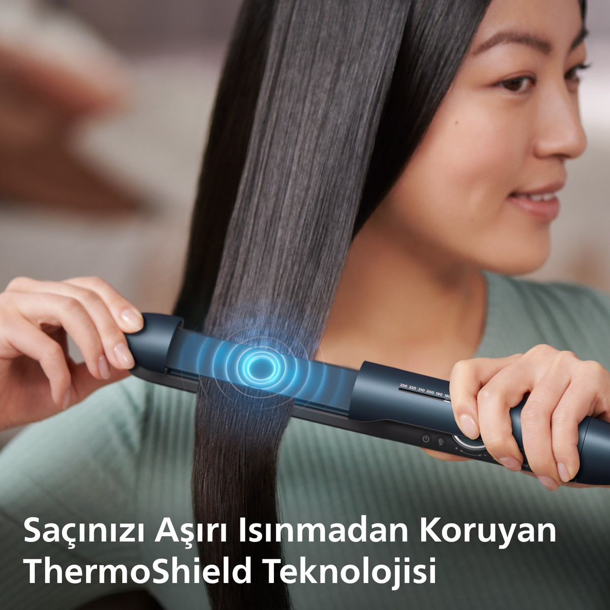 ThermoShield teknolojisi, saçların daha az ısı hasarıyla şekillendirilmesini sağlayabilir. Bu teknoloji düzleştirici sensörünün sıcaklığını düzenleyerek, saçların baştan aşağı eşit olarak şekillenmesine imkan verir.