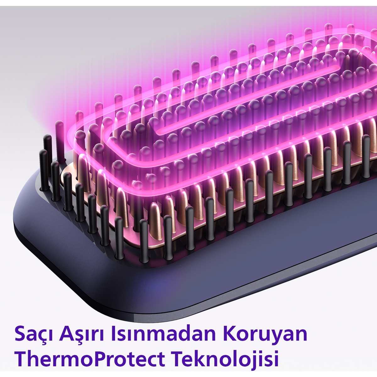 Philips 5000 Serisi Düzleştirici Tarak ile yalnızca 5 dakika doğal görünümlü düz saçlara sahip olun. İyonik bakım sistemine sahip ThermoProtect teknolojisi ve fırça ucu tasarımı sayesinde elektriklenmeyen doğal ve sağlıklı saçlar. -Üçlü fırça ucu tasarımı ile başınızı ısıdan korurken saçınızı nazikçe düzleştirin. -50 saniyede kullanıma hazır. LED dışığı fırçanızın kullanıma hazır olduğunu haber verir. -Saç tipinize göre 3 sıcaklık ayarı (150°C, 170°C, 200°C) bulunur. -ThermoProtect teknolojisi sayesinde fırça kıllarının sıcaklığı, sürtünmeyi azaltırken ısı hasarını en aza indirmek için optimum seviyede kalır. -İyonik bakım teknolojisi milyonlarca iyonu serbest bırakır ve harika görünen, parlak saçlara sahip olmanızı sağlar. -Argan yağı katkılı seramik kaplama fırça kılları, saçlarınızda rahatça kayarak doğal görünümlü düz ve parlak bir saça sahip olmanızı sağlar. -Konforlu dönebilen 1,8M kablo ile rahat kullanım sunar.
